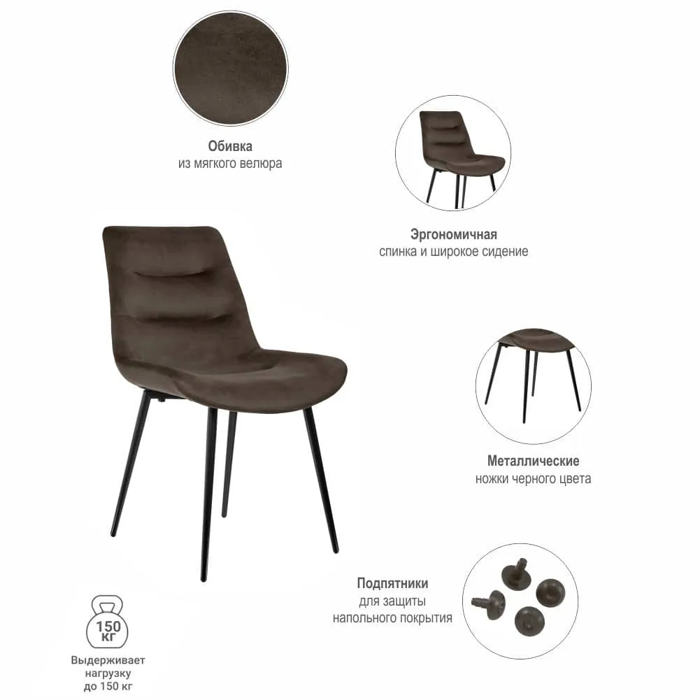 Стулья Chester на устойчивом металлическом каркасе с сиденьем эргономичной формы в нежной велюровой обивке придется по душе любителям комфорта и уюта. Стул гармонично впишется в интерьер на кухне, в гостиной или за письменным столом.