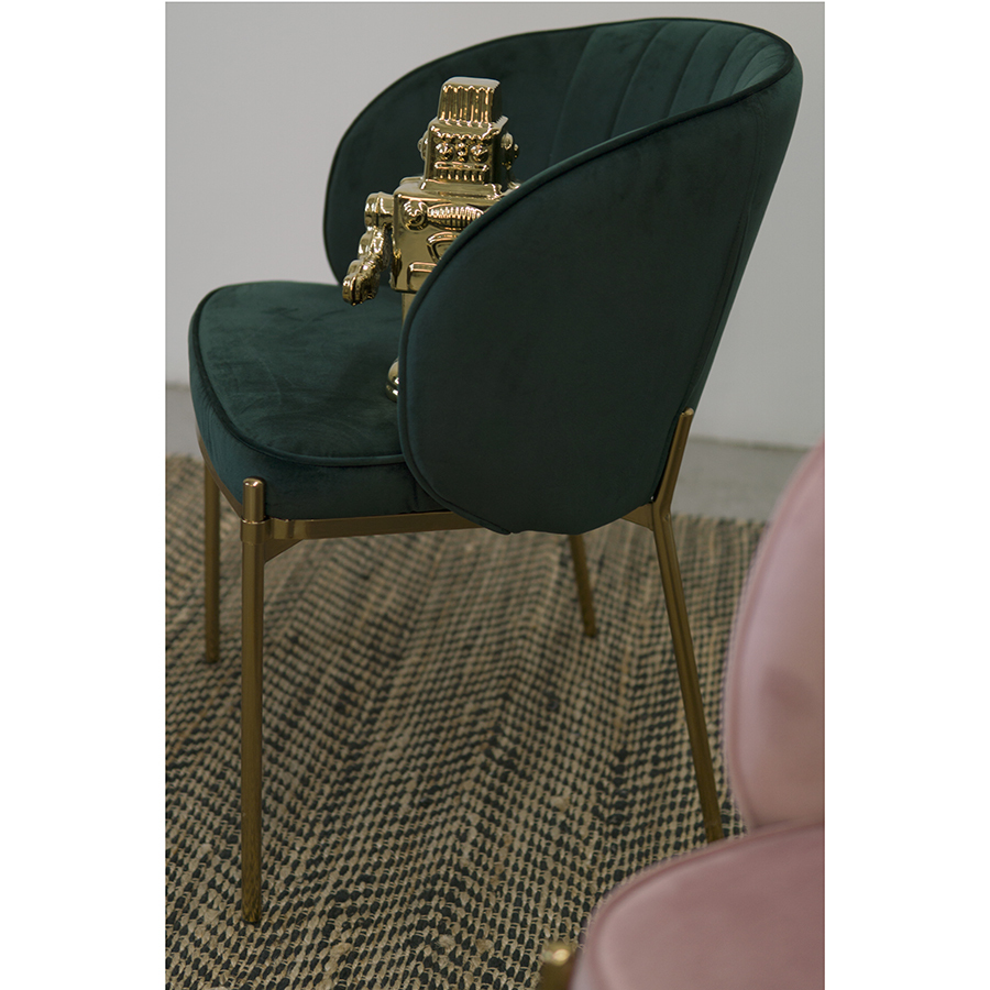 Комфорт во время отдыха на стуле создается за счет мягкого сиденья с наполнителем из пенополиуретана и высокой закругленной спинки. Обивка из бархатистого велюра, украшенная декоративной строчкой, придает модели особый шарм. Эстетический потенциал материала настолько высок, что ему сложно найти конкурентов. Помимо презентабельного вида и приятных тактильных ощущений, ткань обладает хорошими эксплуатационными характеристиками, такими как прочность, износоустойчивость и долговечность. Ножки мебели выполнены из стали, что обеспечивает конструкции надежность и защиту от коррозии.