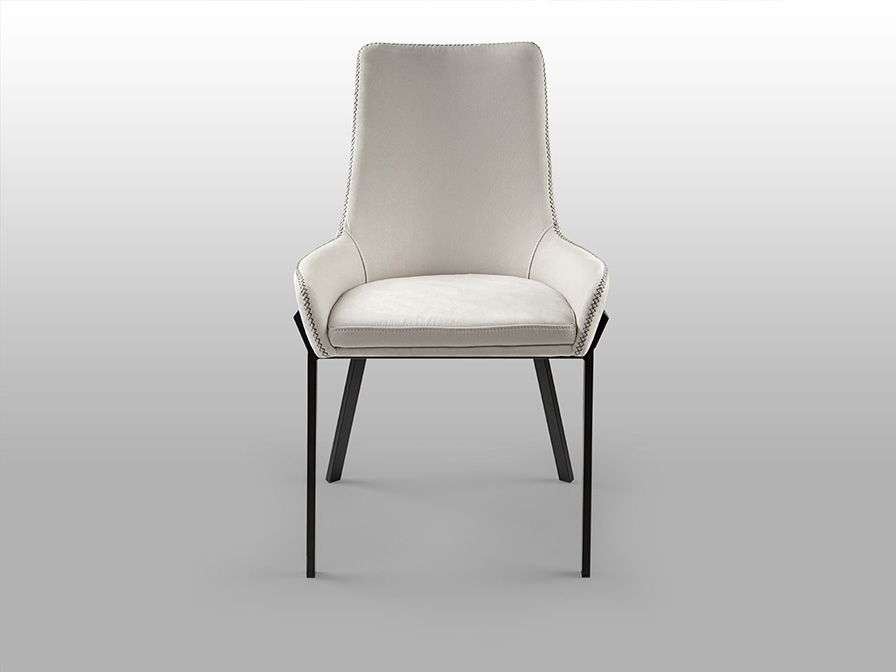 Стул из металла, матовая черная отделка. Текстильная обивка из 100% полиэстера белого цвета с декоративной серой строчкой.