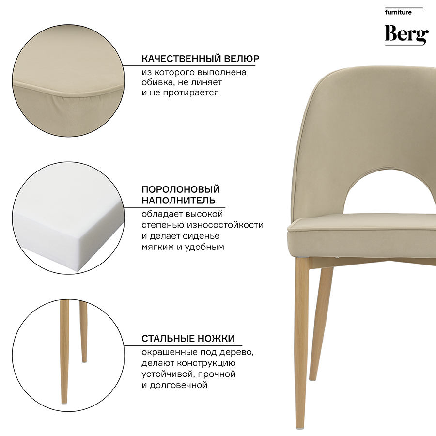 Конструкция устойчива, прочна и долговечна. Широкая спинка обеспечивает дополнительный комфорт. Материал обивки – качественный велюр, который не линяет и не протирается. Ножки выполнены из стали. Наполнитель – поролон. Максимальная нагрузка – 120 кг.