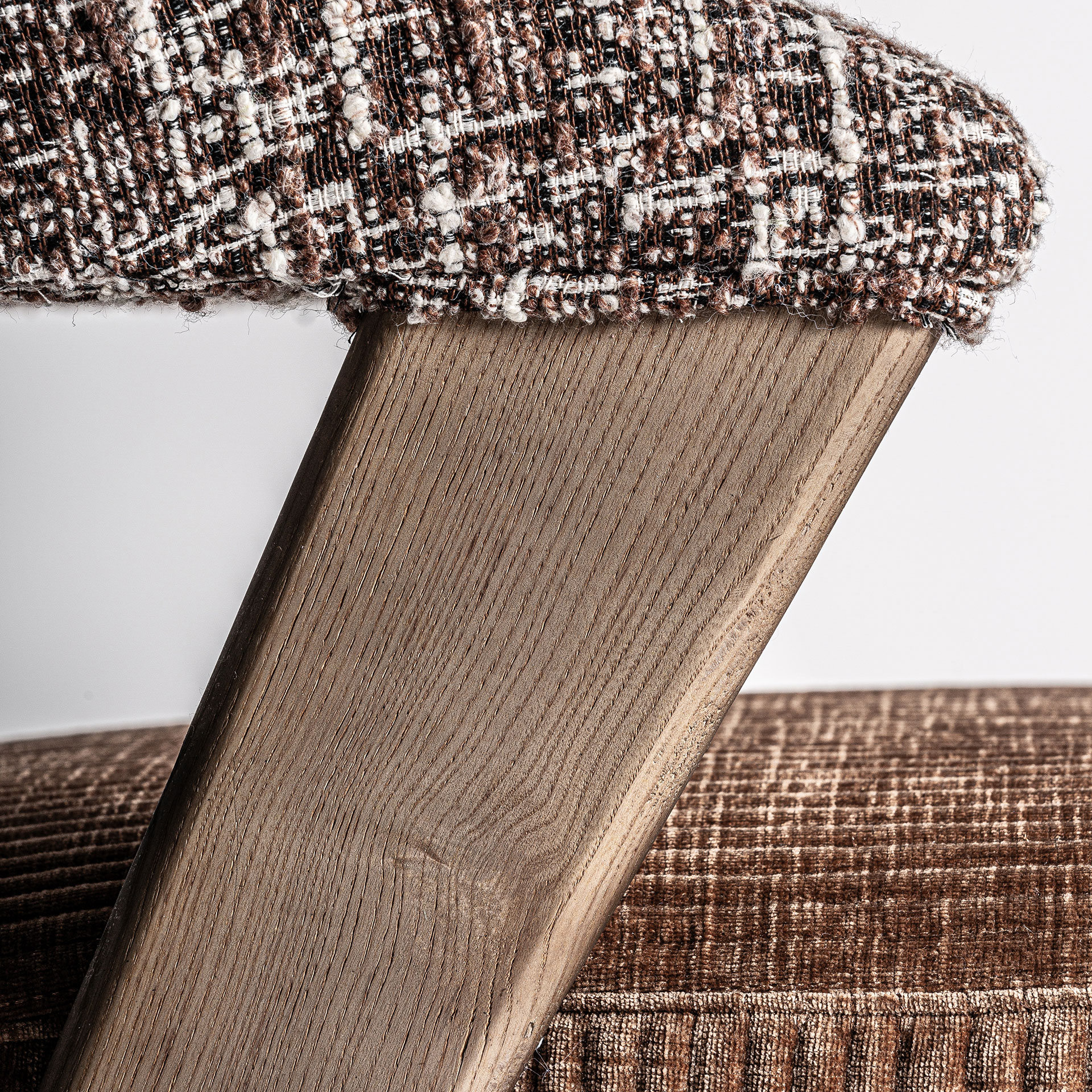 Стул Kamenz в современном стиле, изготовлен из коричневого полиэстера с пятнистой отделкой в сочетании с коричневым дубом и каучуковым деревом.