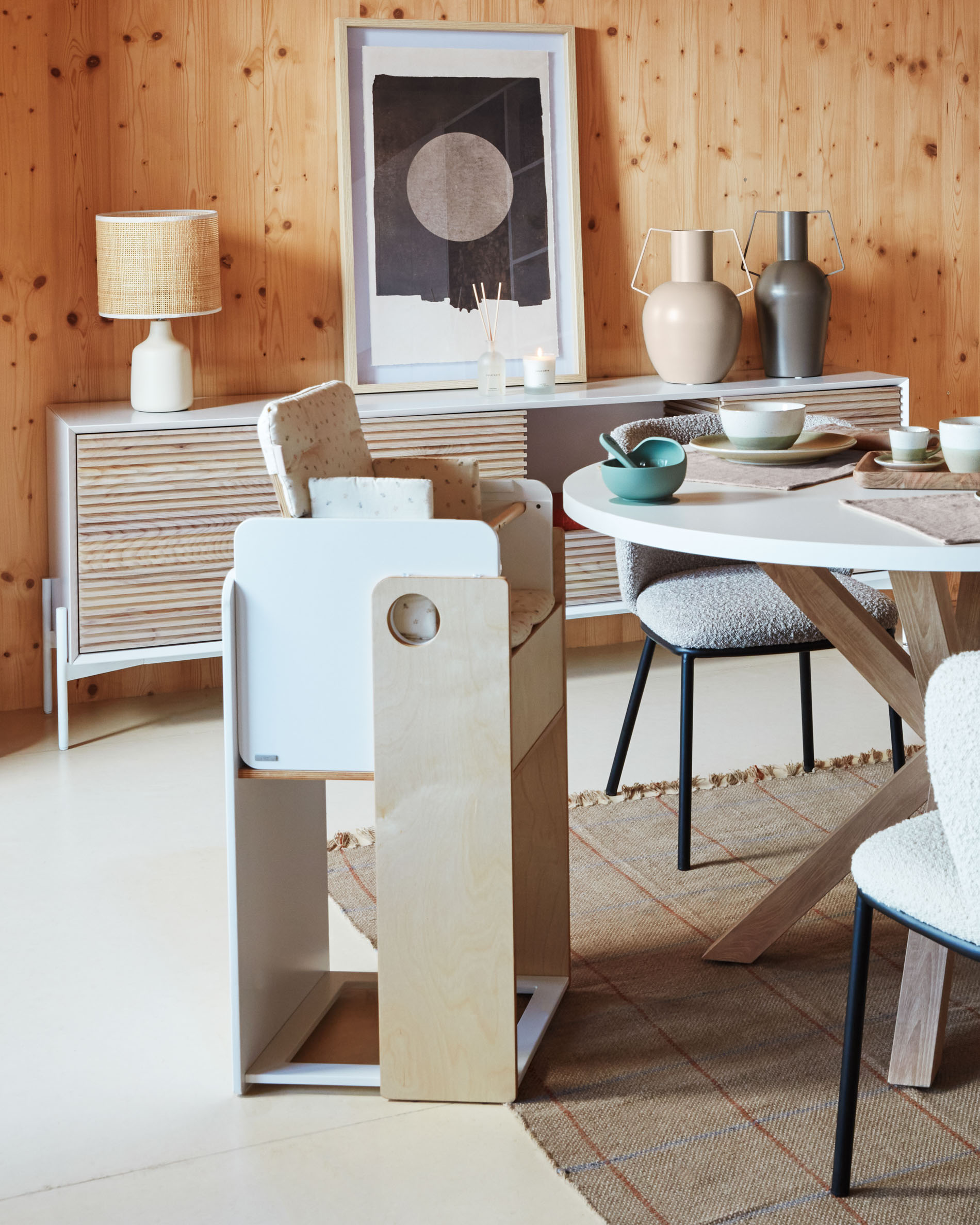 Сиденье также сделано из дерева и дополнено текстильной подушкой.