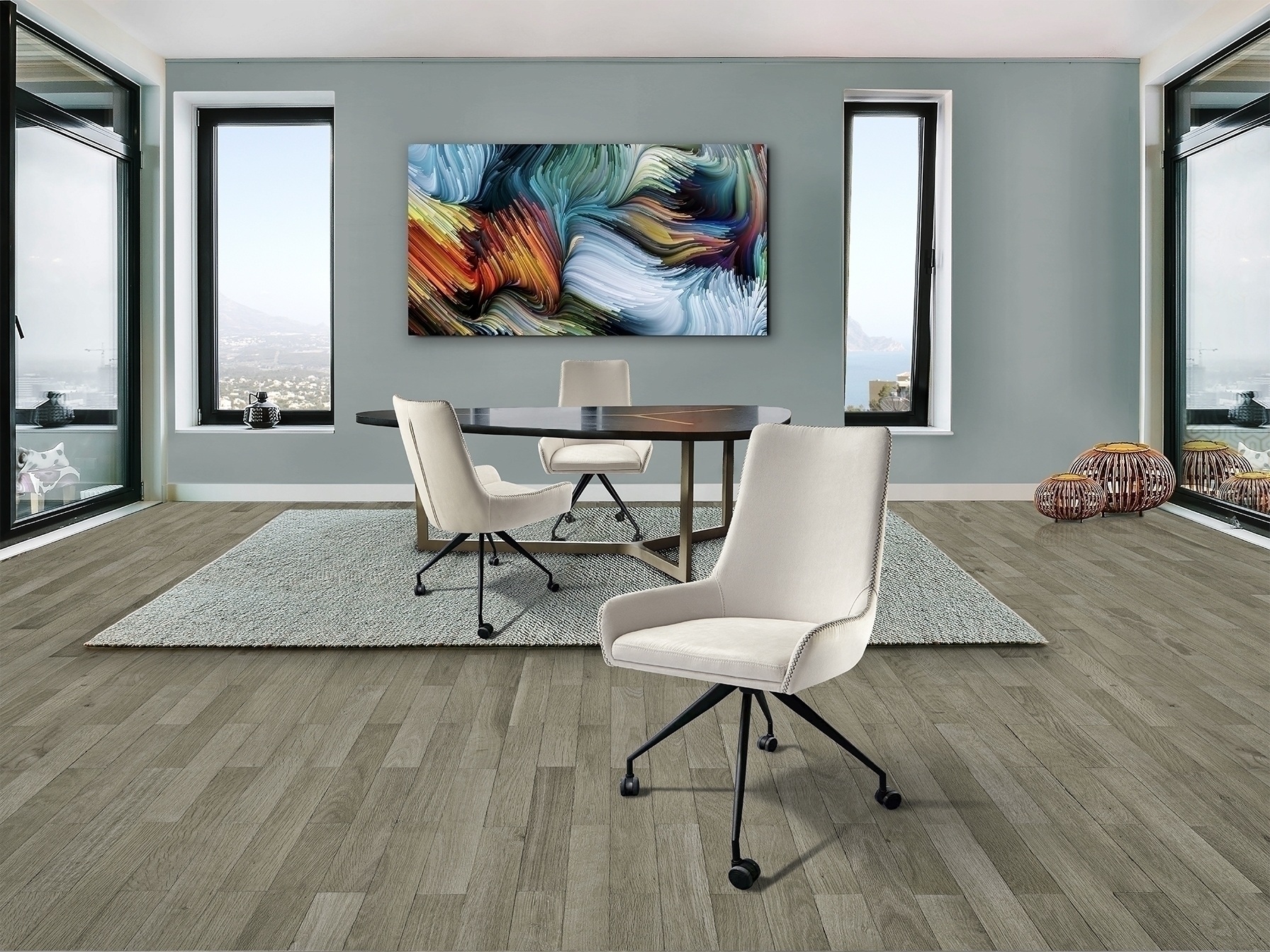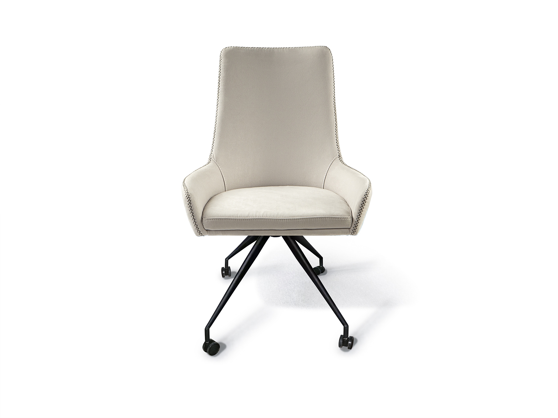 Стул с колесиками, изготовлен из металла, матового черного цвета. Обивка из 100% полиэстера белого цвета с серой декоративной строчкой.