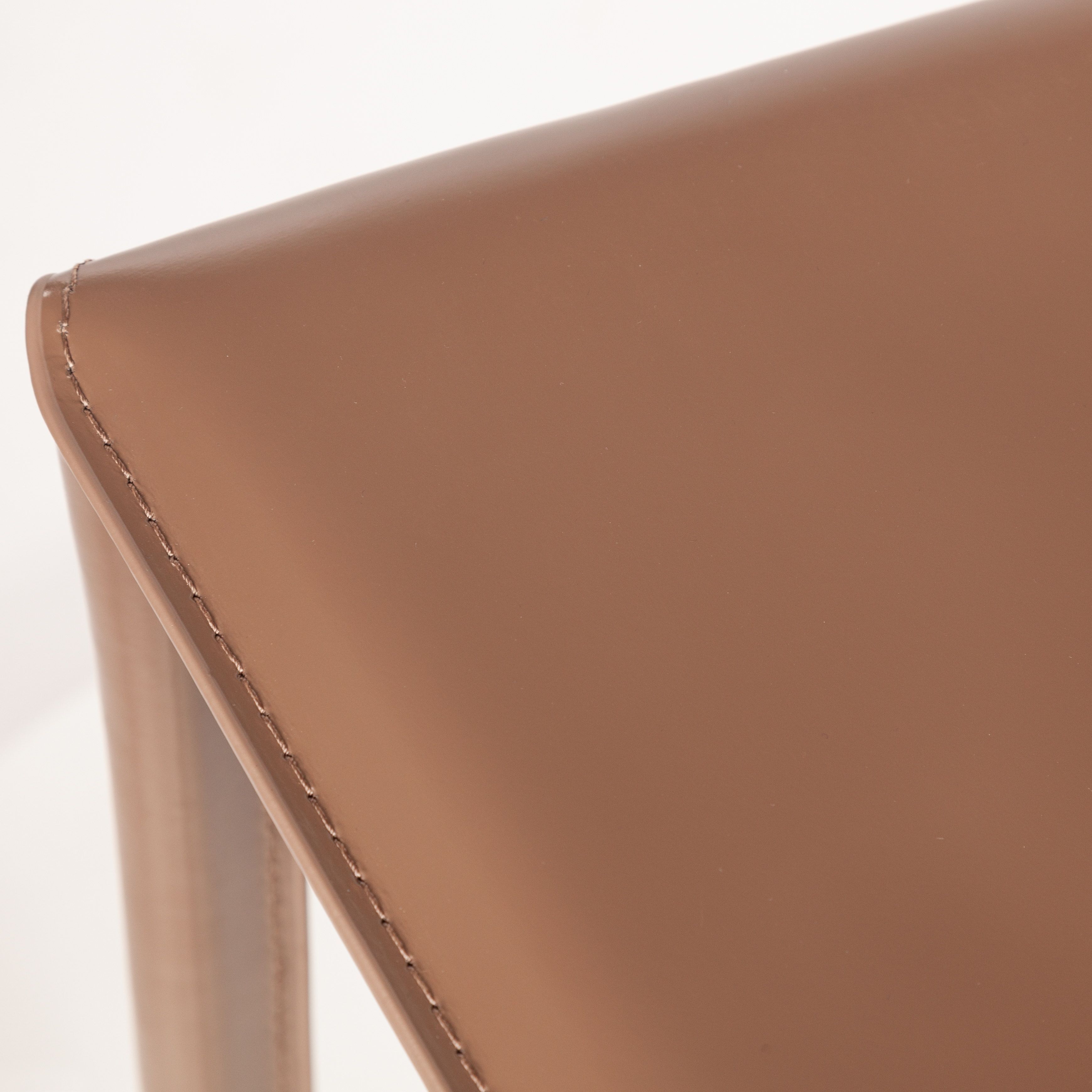 Металлические ножки как продолжение спинки и сиденья обтянуты кожей такого же цвета. Неоспоримым преимущество данной модели является практичность и долговечность материалов, из которых она выполнена, легкость в уходе, а также возможность его штабелирования.