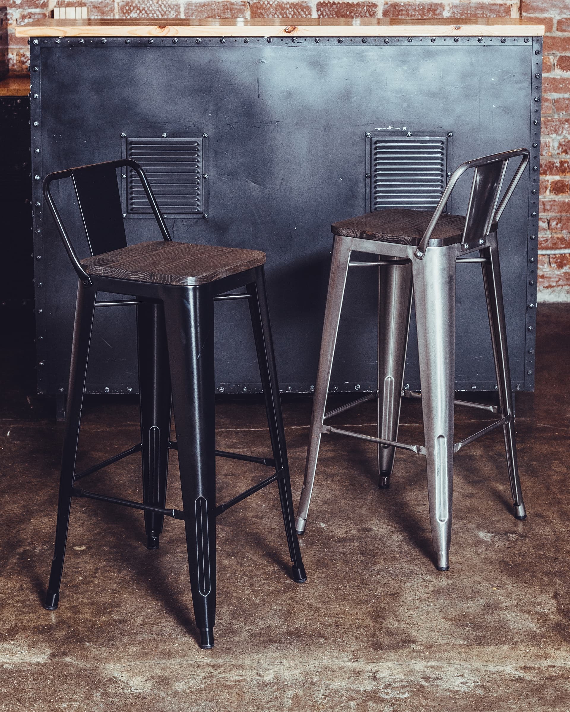 Стул Stool Group полубарный TOLIX WOOD со спинкой серебристый матовый, широкая низкая спинка, оцинкованный металл с порошковым напылением, сиденье из натурального дерева