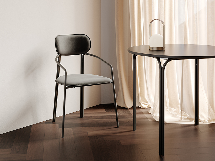 Каркас стула Round состоит из трех стремящихся вверх элементов, которые образуют округлый, словно окутывающий корпус. За счет отсутствия прямых углов создается легкий, гармоничный силуэт.