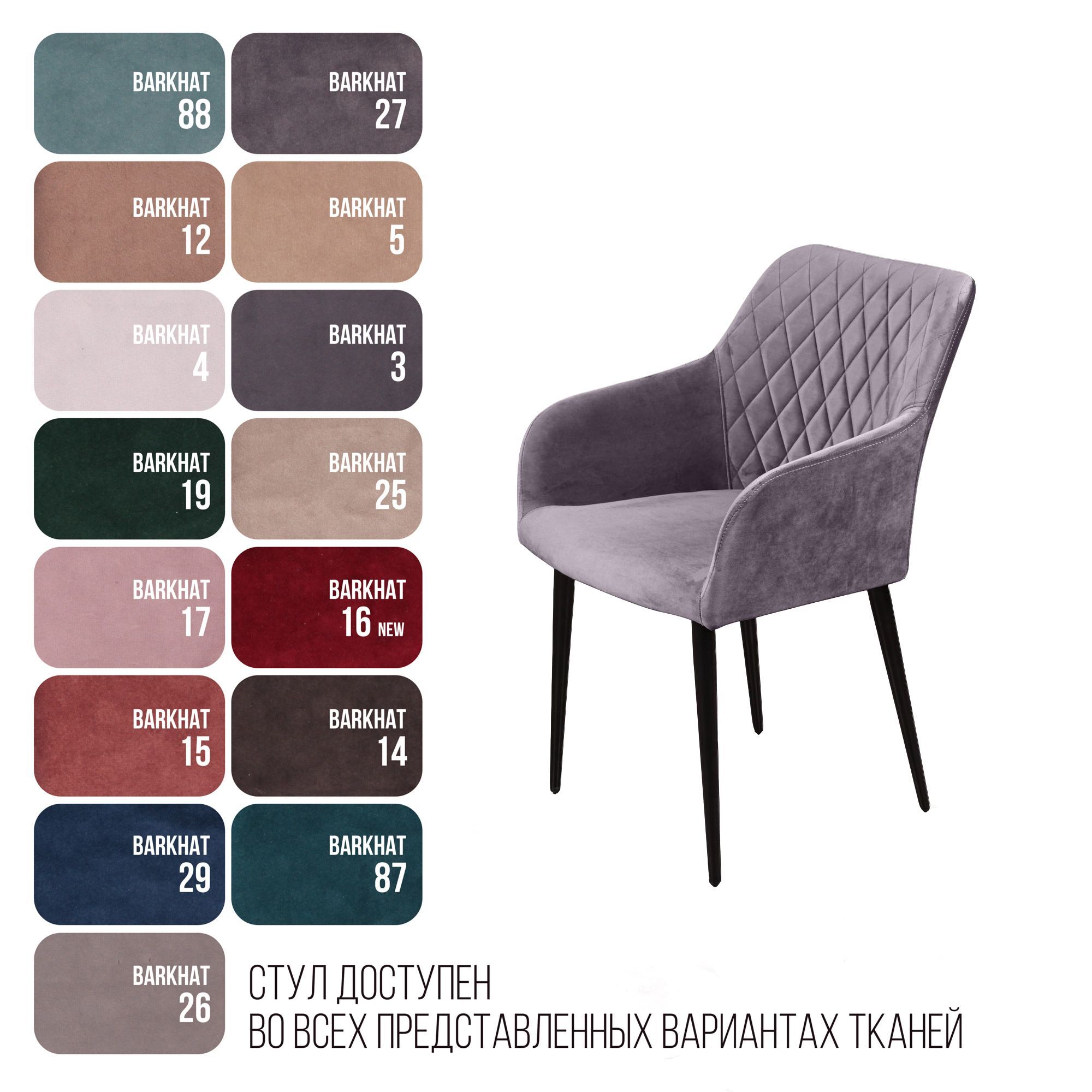 strong*Оттенок может выглядеть по-разному в зависимости от направления ворса./strong Роскошный и уютный стул в стиле арт-деко. Смотрится дорого, стильно и эффектно. Он создан, чтобы очаровывать с первого взгляда. Плавные линии, изящные ножки, просторное сиденье и высокие подлокотники делают модель невероятно удобной для отдыха. Стильная отделка ромбом на спинке и сиденье в сочетании с благородным бархатом создает неповторимые переливы и придает стулу особую утонченность. Обивка Мягкий бархатистый велюр, высококачественный материал с повышенной износостойкостью. Он прост в уходе и не потеряет достойный вид долгое время. Ткань прочная, специально предназначена для ежедневного использования дома или в заведениях общественного типа (кафе, рестораны). Наполнитель В качестве наполнителя используется литой (формованный) пенополиуретан высокой плотности. Даже при длительном использовании он не теряет форму и не деформируется. Такое наполнение гарантирует долгий срок службы изделия, что особенно важно для коммерческого использования (при эксплуатации в сегменте HоReCa). Ножки Изюминка стула Robert – металлические ножки черного матового цвета (могут быть белыми), излишне скошенные назад, как часть дизайнерской задумки. На ножках предусмотрены специальные пластиковые накладки, которые придают стулу дополнительную устойчивость и защищают пол от царапин. Гарантия Тщательная проверка качества изделий осуществляется на всех этапах производства: от подбора материалов и комплектующих до проверки готового изделия перед отправкой. На все изделия Top concept мы предоставляем гарантию 18 месяцев.