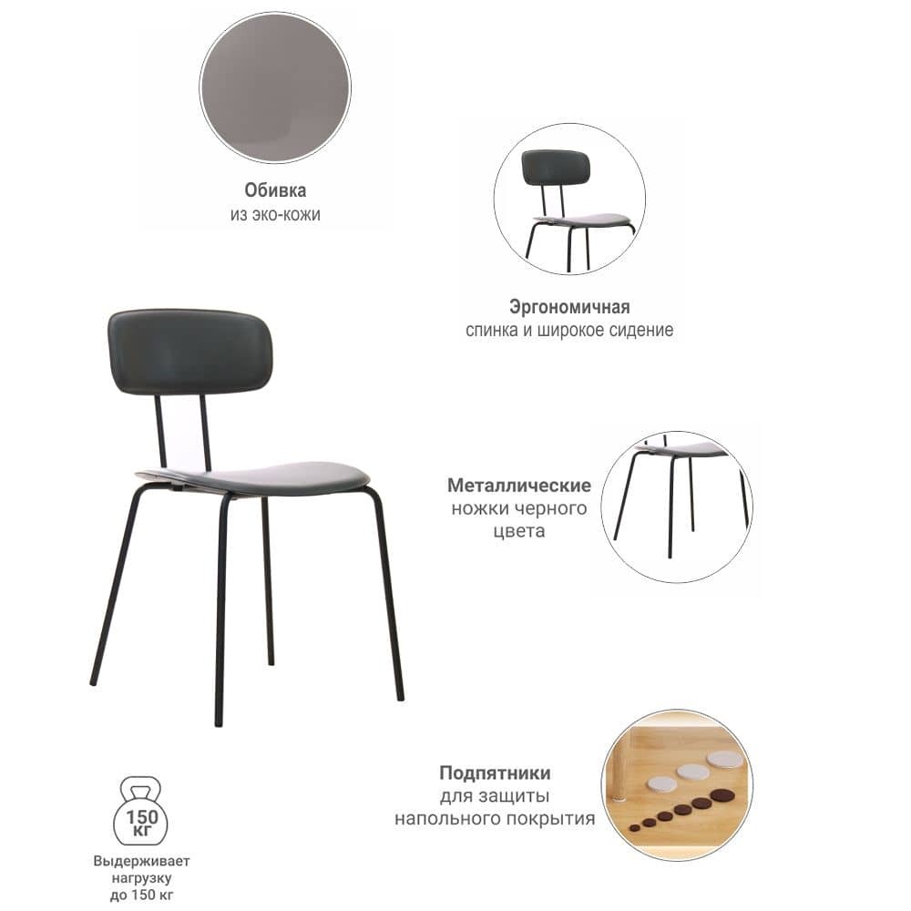 Стильный и лаконичный стул Tokyo на металлическом каркасе. Обивка выполнена из эко-кожи серого цвета. Широкое сиденье и спинка обеспечивает удобную посадку и уют. Такая модель стула прекрасно дополнит интерьер кухни или гостиной, а также кафе, ресторана или бара в стиле Лофт. Конструктивные особенности стула позволяют складывать их в стопки (штабели), что существенно экономит пространство.