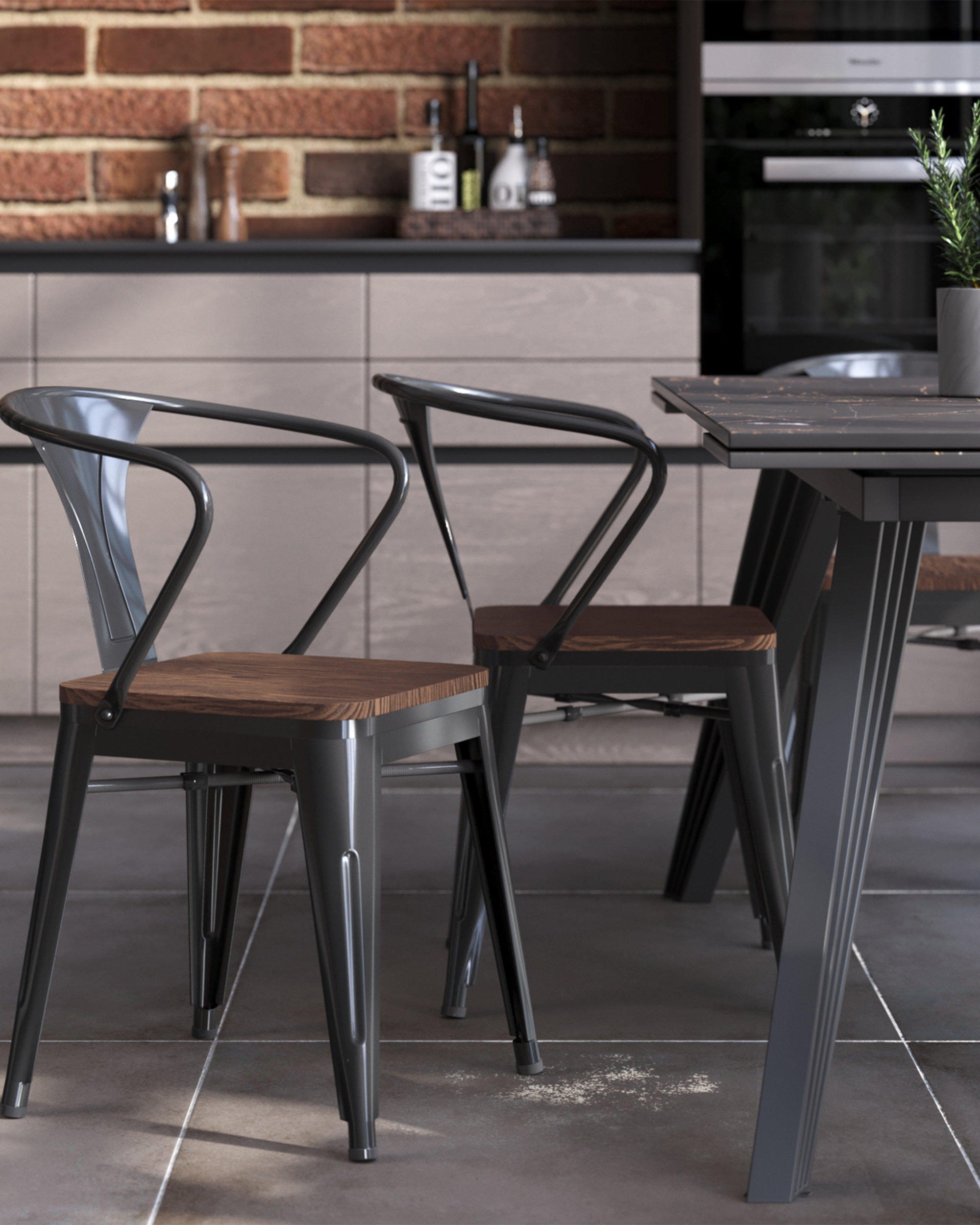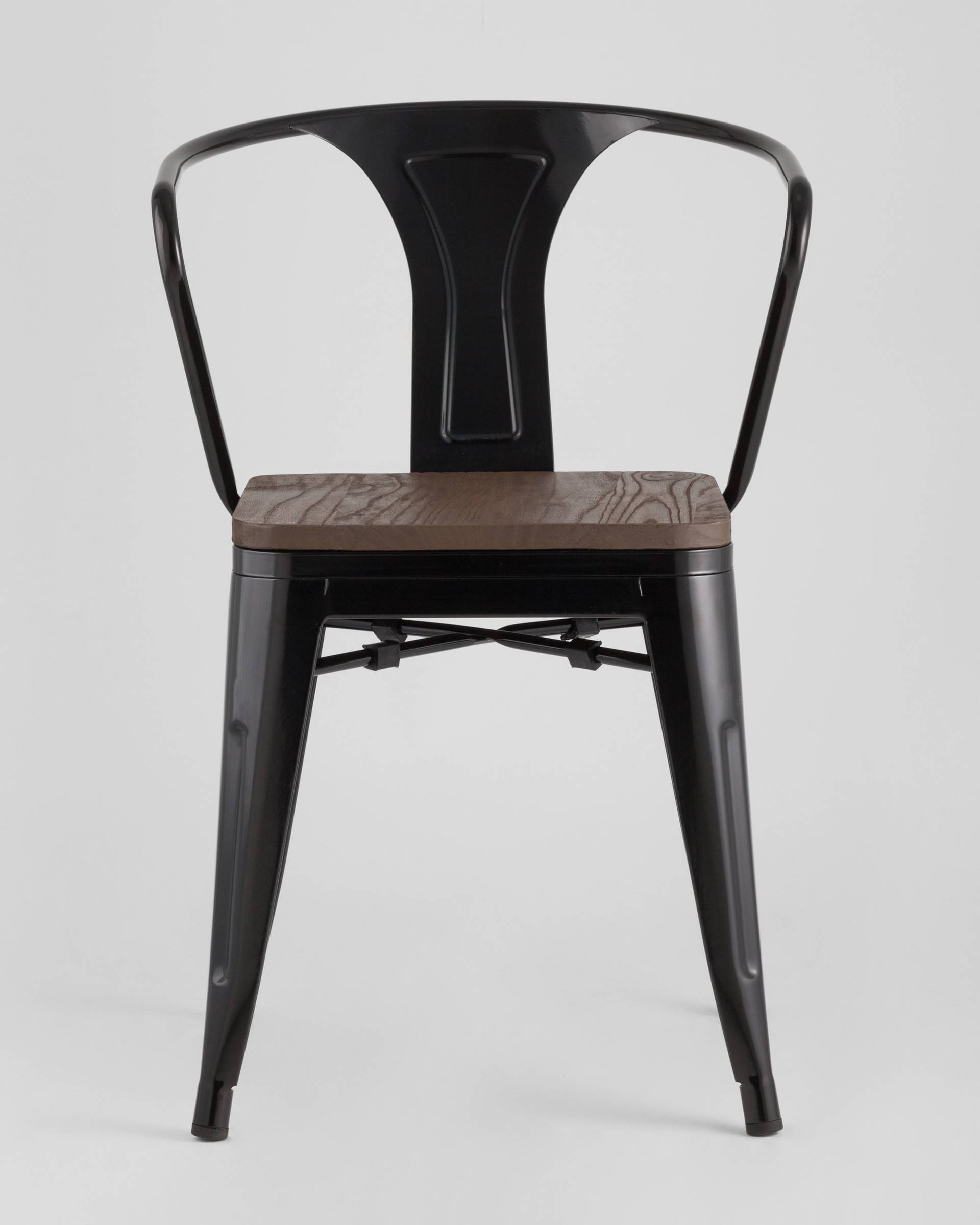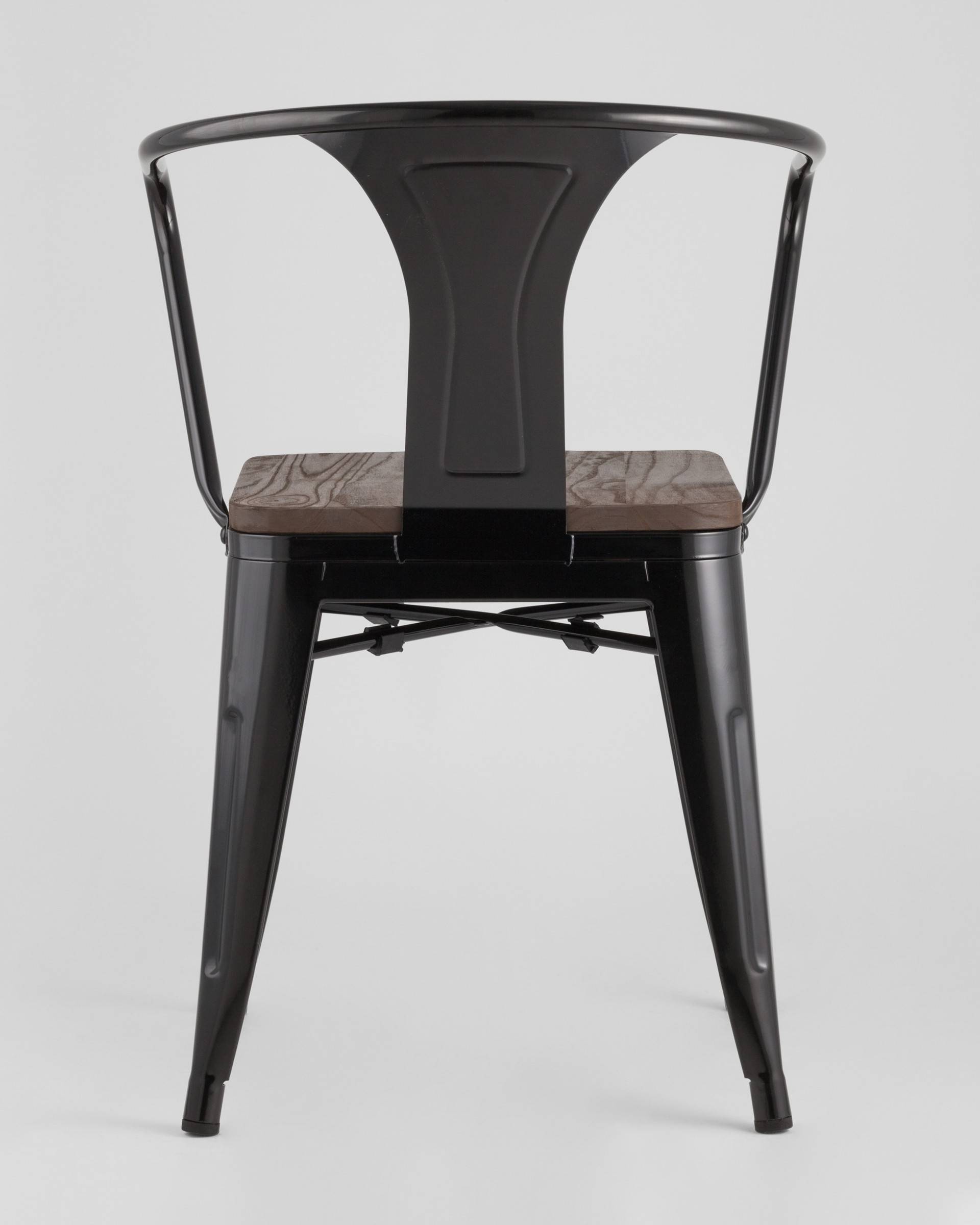 Стул Stool Group TOLIX с подлокотниками черный глянцевый + темное дерево, металлическое серебристое основание, оцинкованная сталь с порошковым напылением, сиденье из натурального дерева