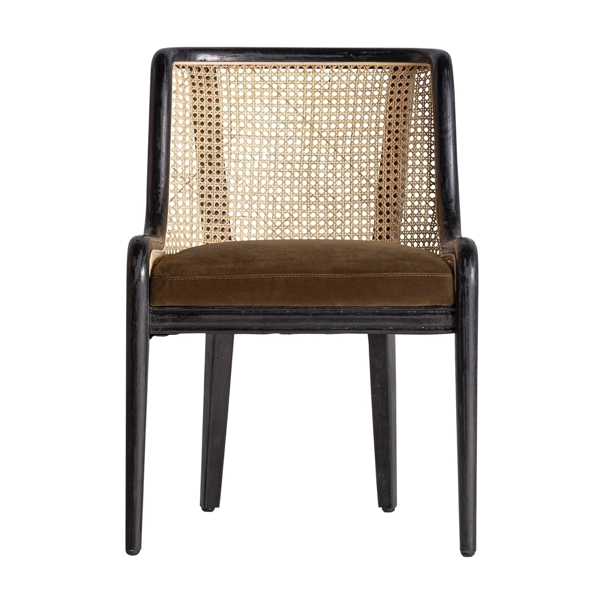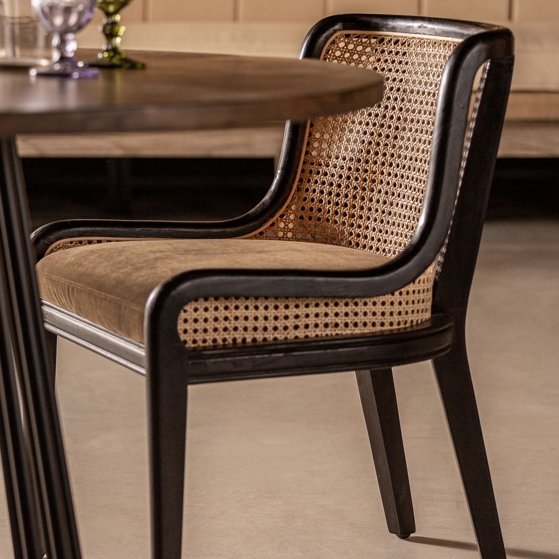 Стул Velburg, черный цвет, колониальный стиль. Изготовлен из ротанга в сочетании с каучуковым деревом и бархатом.