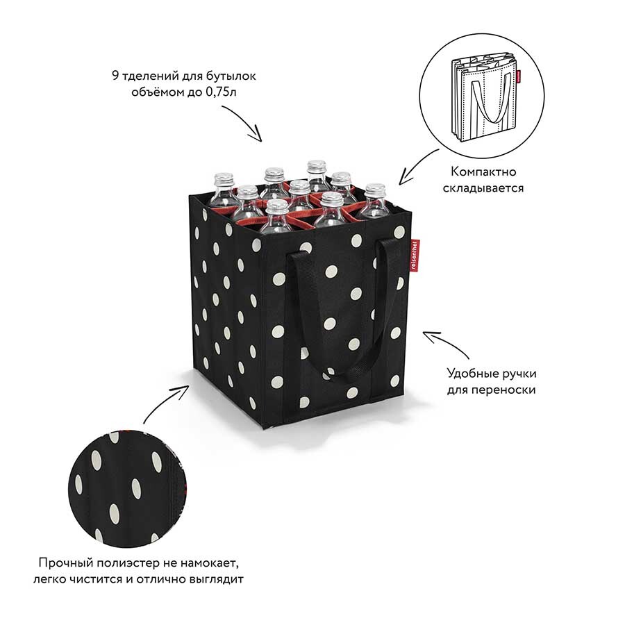 9 отделений для бутылок объемом до 0,75 литра. По бокам две ручки для переноски, соединяемые между собой липучкой. Сумка легко складывается для компактного хранения.