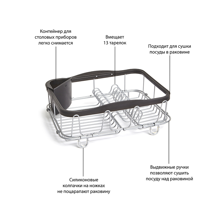 Раздвигающиеся ручки добавлены для удобного хранения над раковиной (если там размораживаются продукты, например). С боковой стороны добавлены 4 удобных выступа для сушки стаканов или чашек. В комплект входит съемный уголок для хранения столовых приборов. Ручки раздвигаются до 48.5 см.