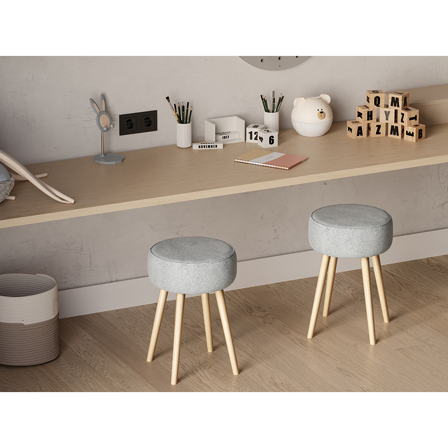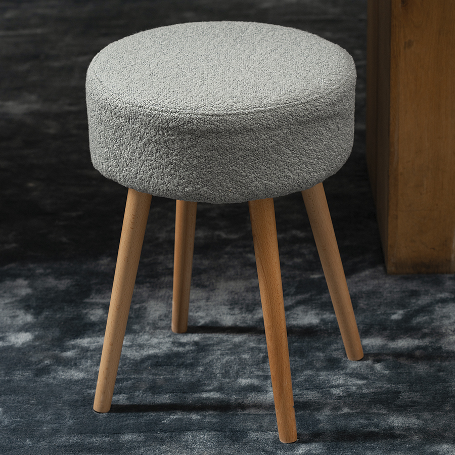 Мягкое сиденье с обивкой из буклированной ткани и деревянные ножки делают мебель уютной и оригинальной. Такое сочетание материалов легко комбинируется практически с любой современной отделкой и декором. Ткань приятная на ощупь, при этом прочная и долговечная. Табурет также может использоваться как дополнительное место для сидения в комнате или в качестве подставки для ног во время отдыха на кресле или диване.