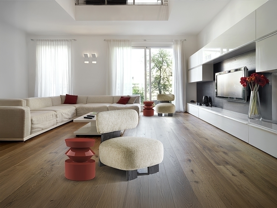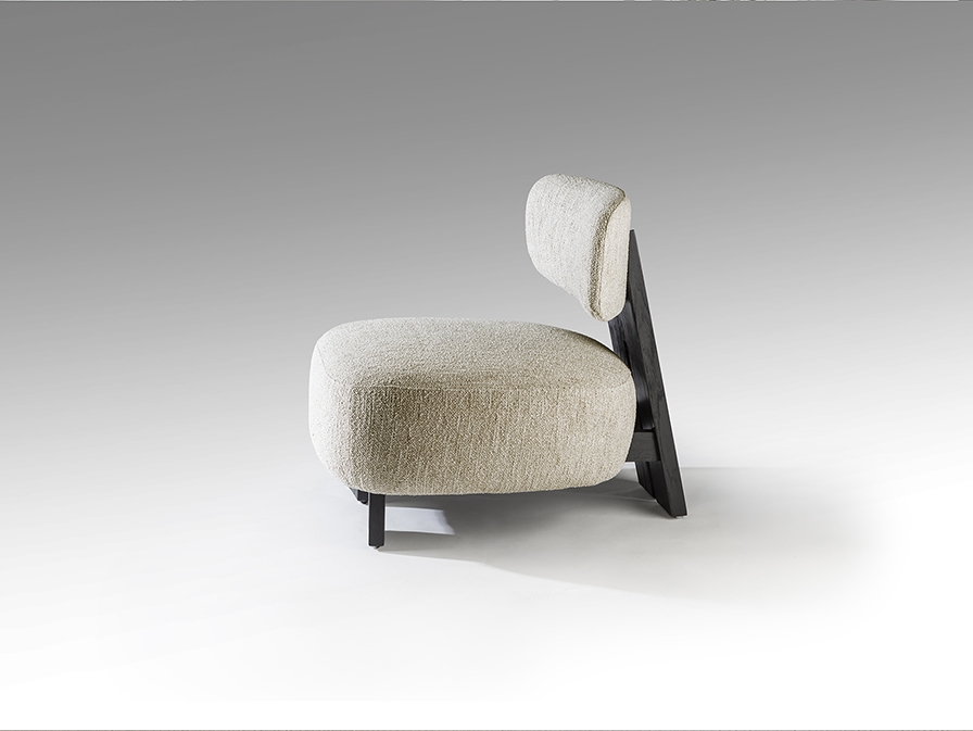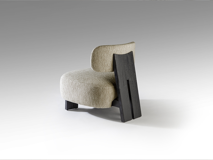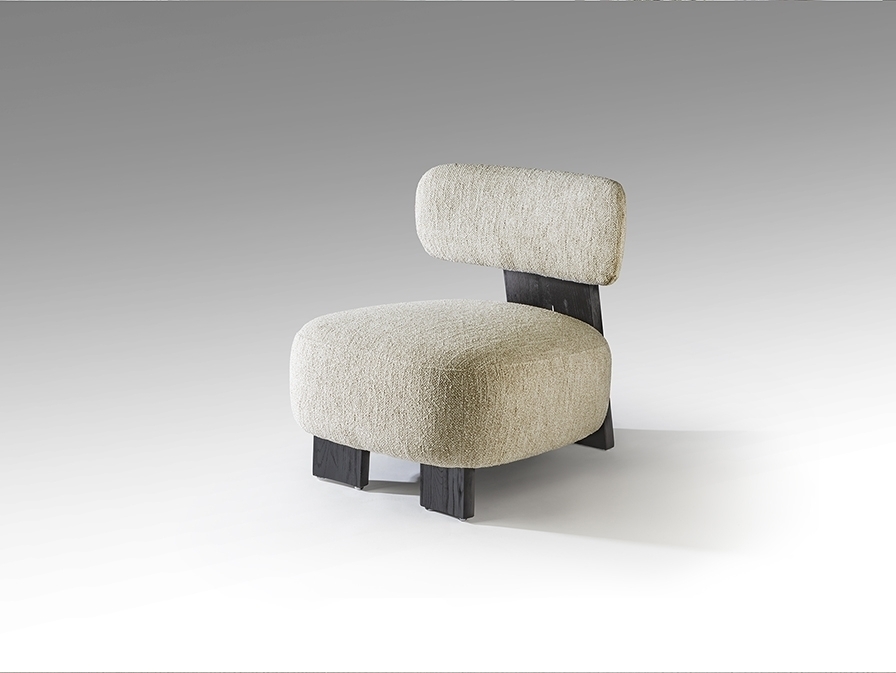 Кресло из дерева, отделанное черным цветом и обитое пестрым шениллом цвета экре.