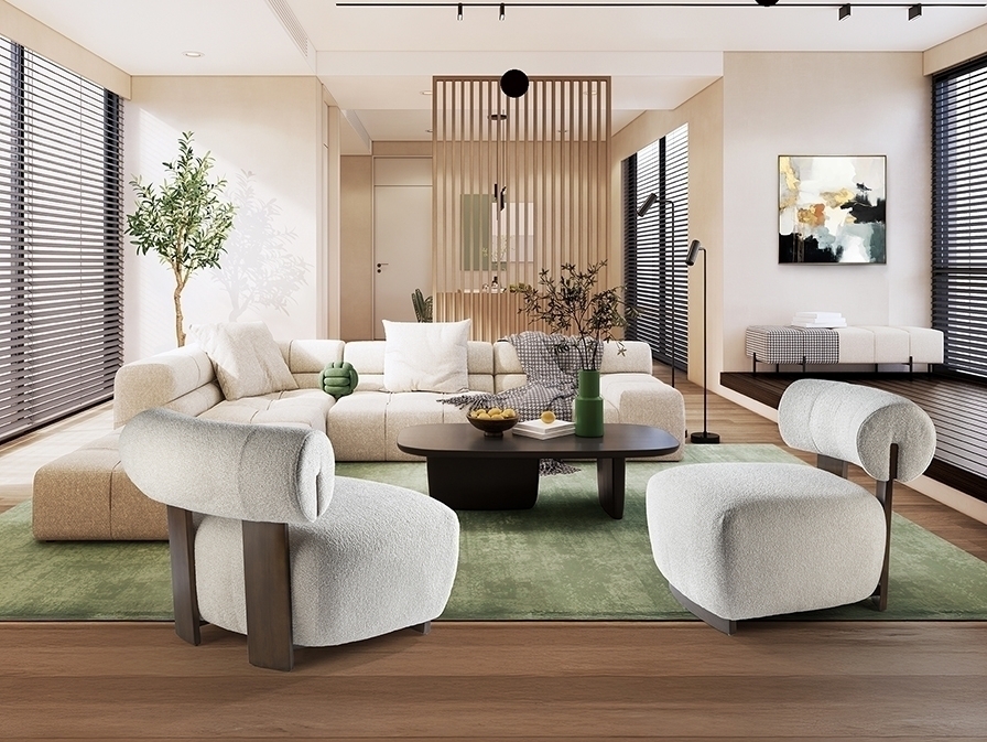 Кресло из дерева с черной отделкой и обивкой из шенилла цвета экрю.