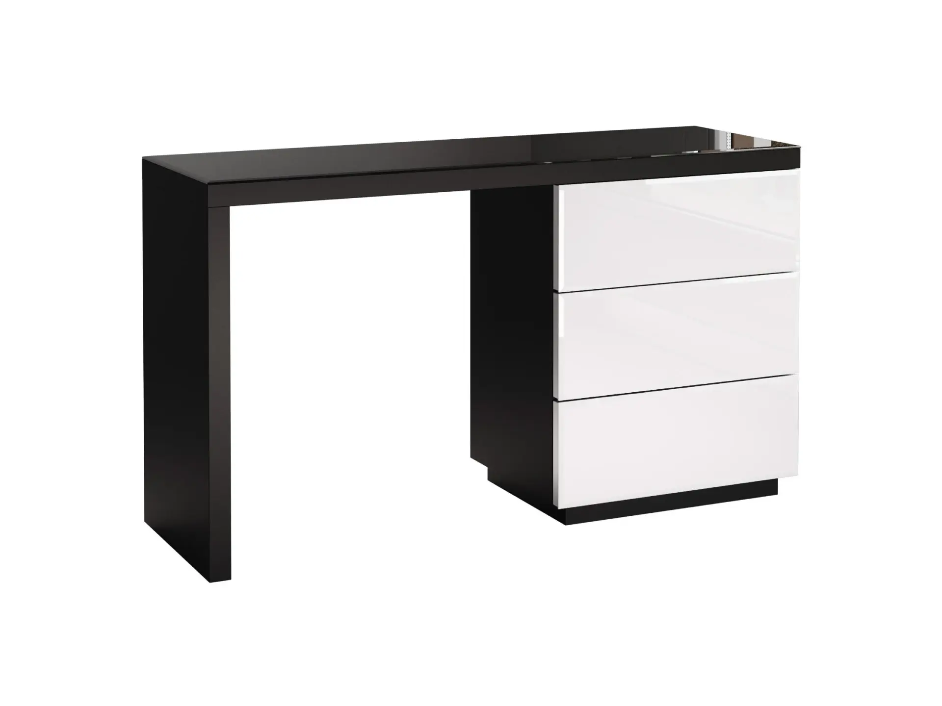 Туалетный столик с тремя выдвижными ящиками. Столешница и фасадные стенки ящиков декорированы стеклом. Стол может быть собран с правым или левым расположением тумбы с ящиками. Ящики открываются по принципу «нажал — открыл».