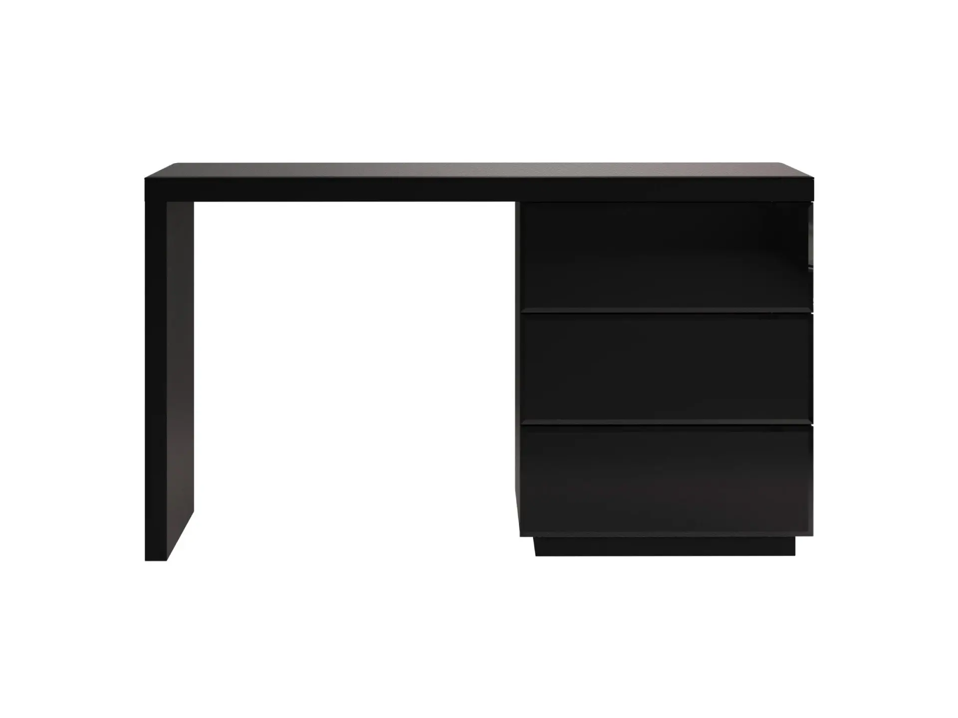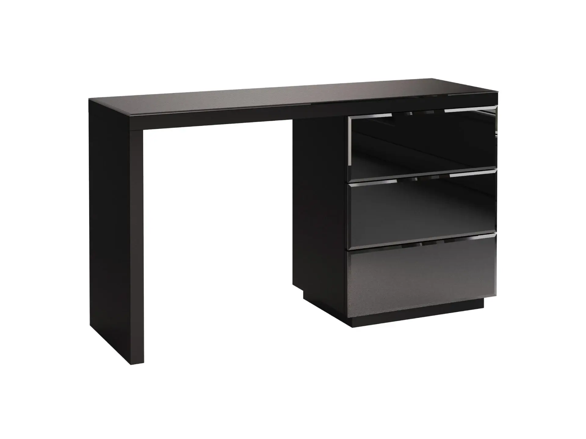 Туалетный столик с тремя выдвижными ящиками. Столешница и фасадные стенки ящиков декорированы стеклом. Стол может быть собран с правым или левым расположением тумбы с ящиками. Ящики открываются по принципу «нажал — открыл».