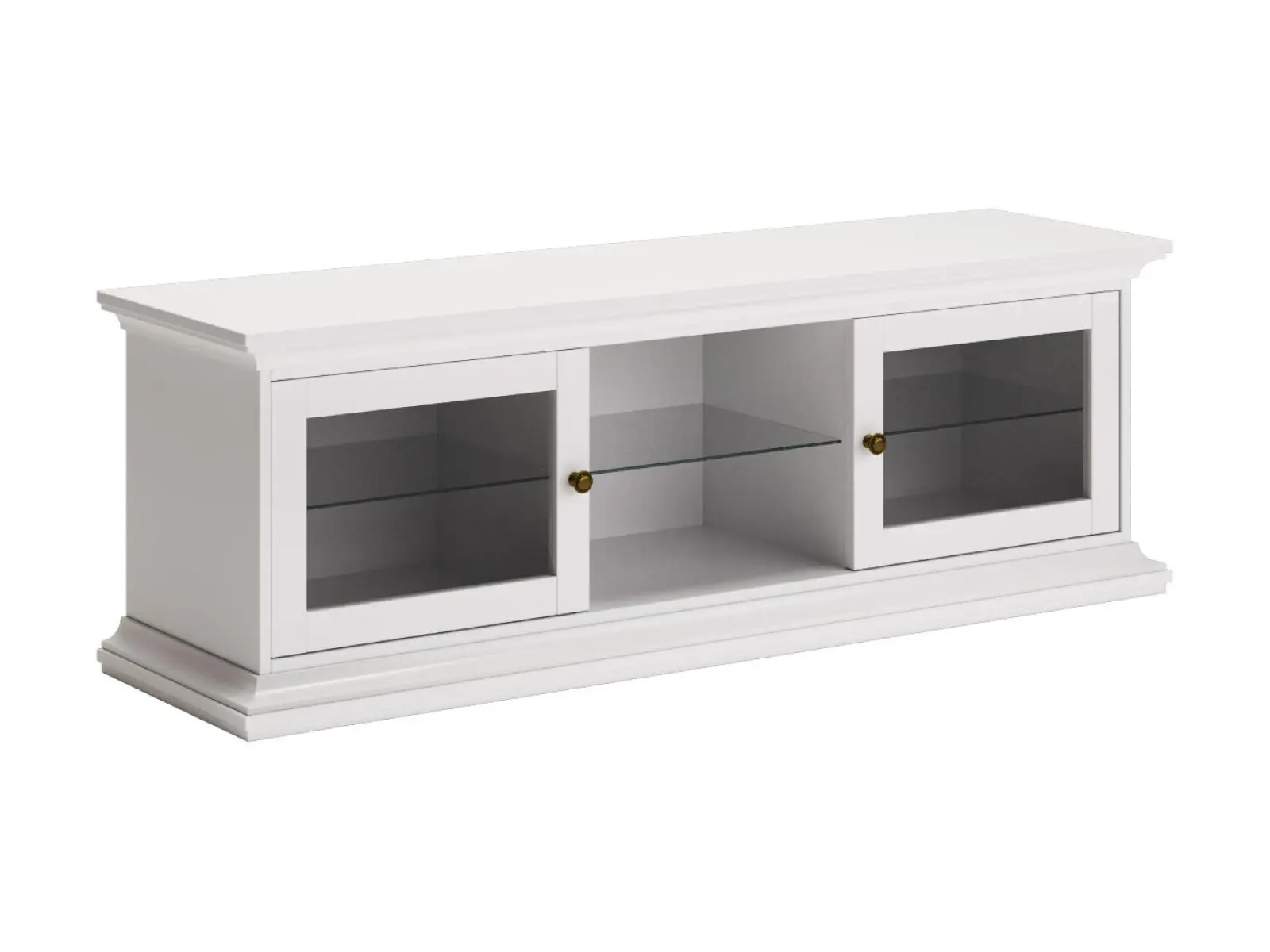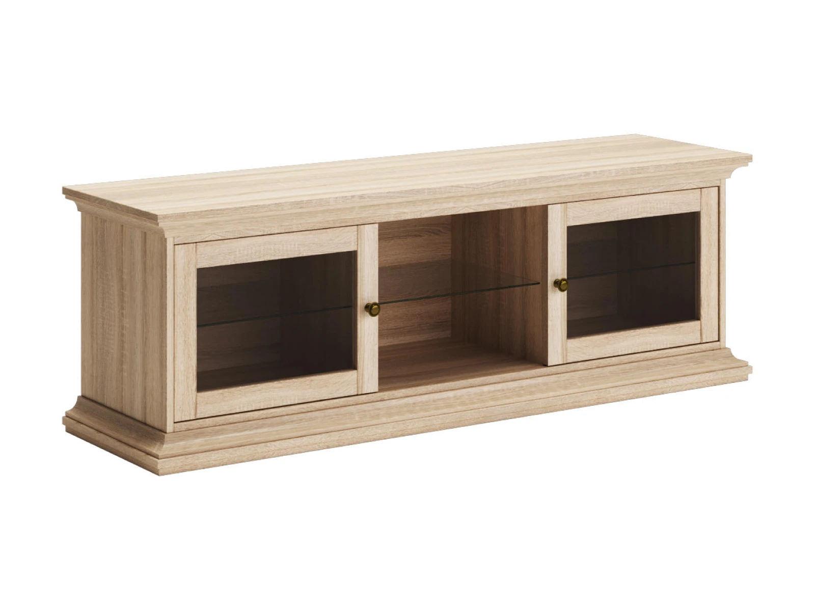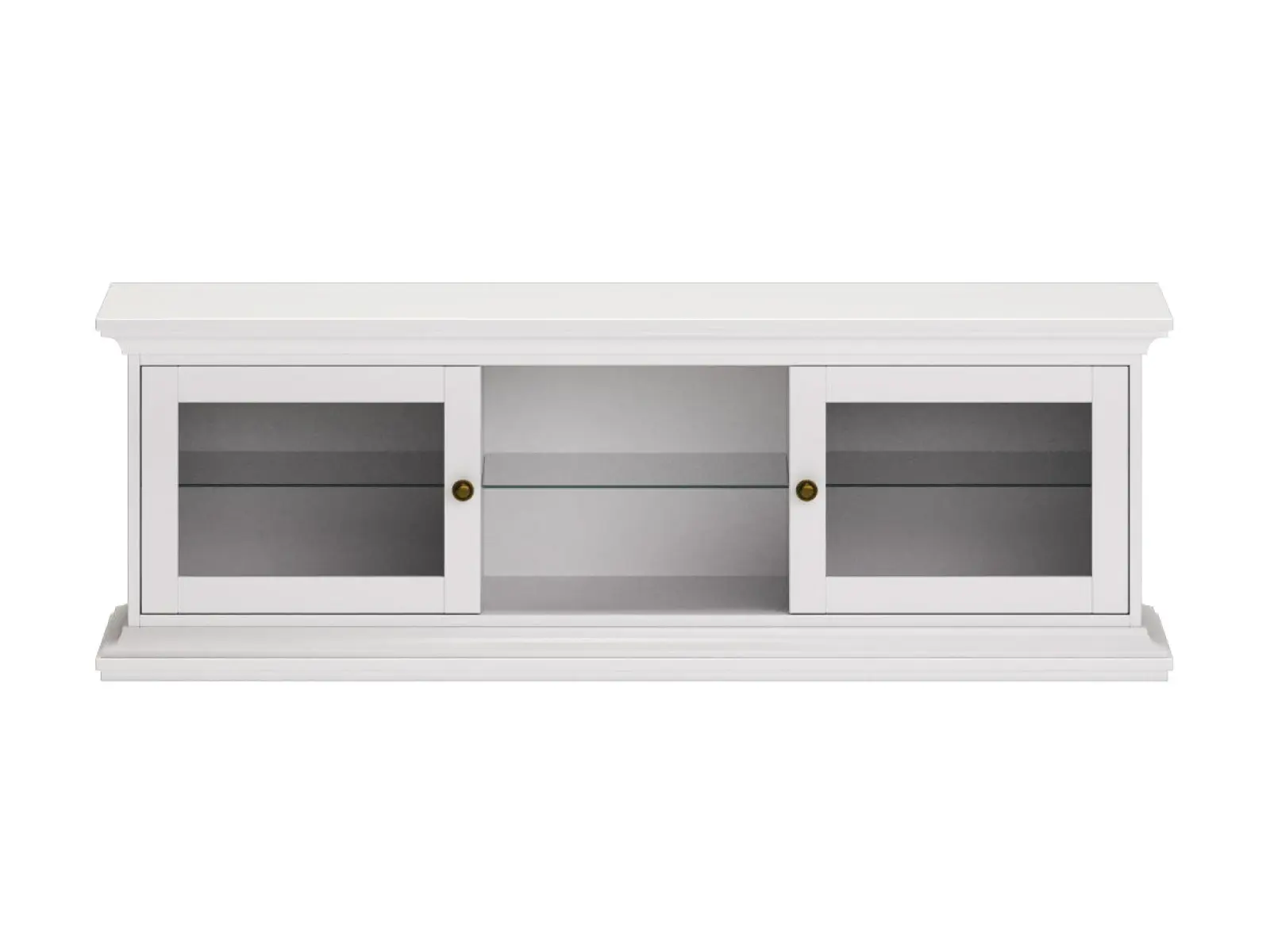 Тумба под ТВ состоит из трех отделений. Среднее отделение открытое, со съемной стеклянной полкой. Левое и правое отделения с распашными дверцами и стеклянными съемными полками.