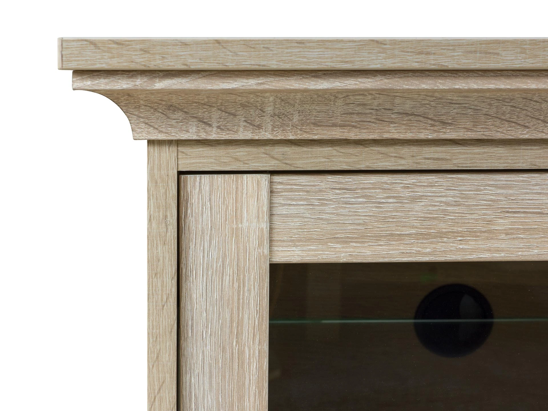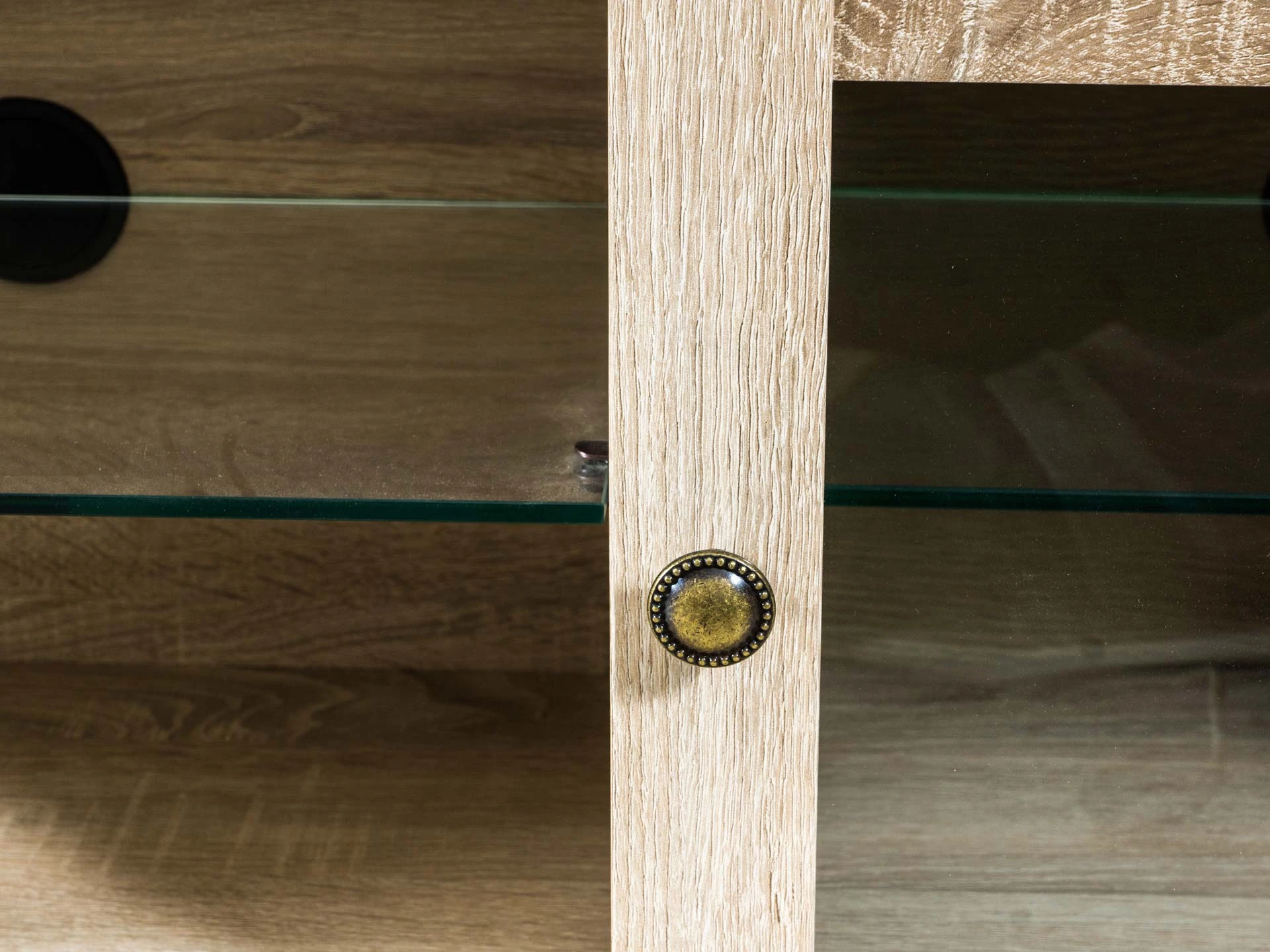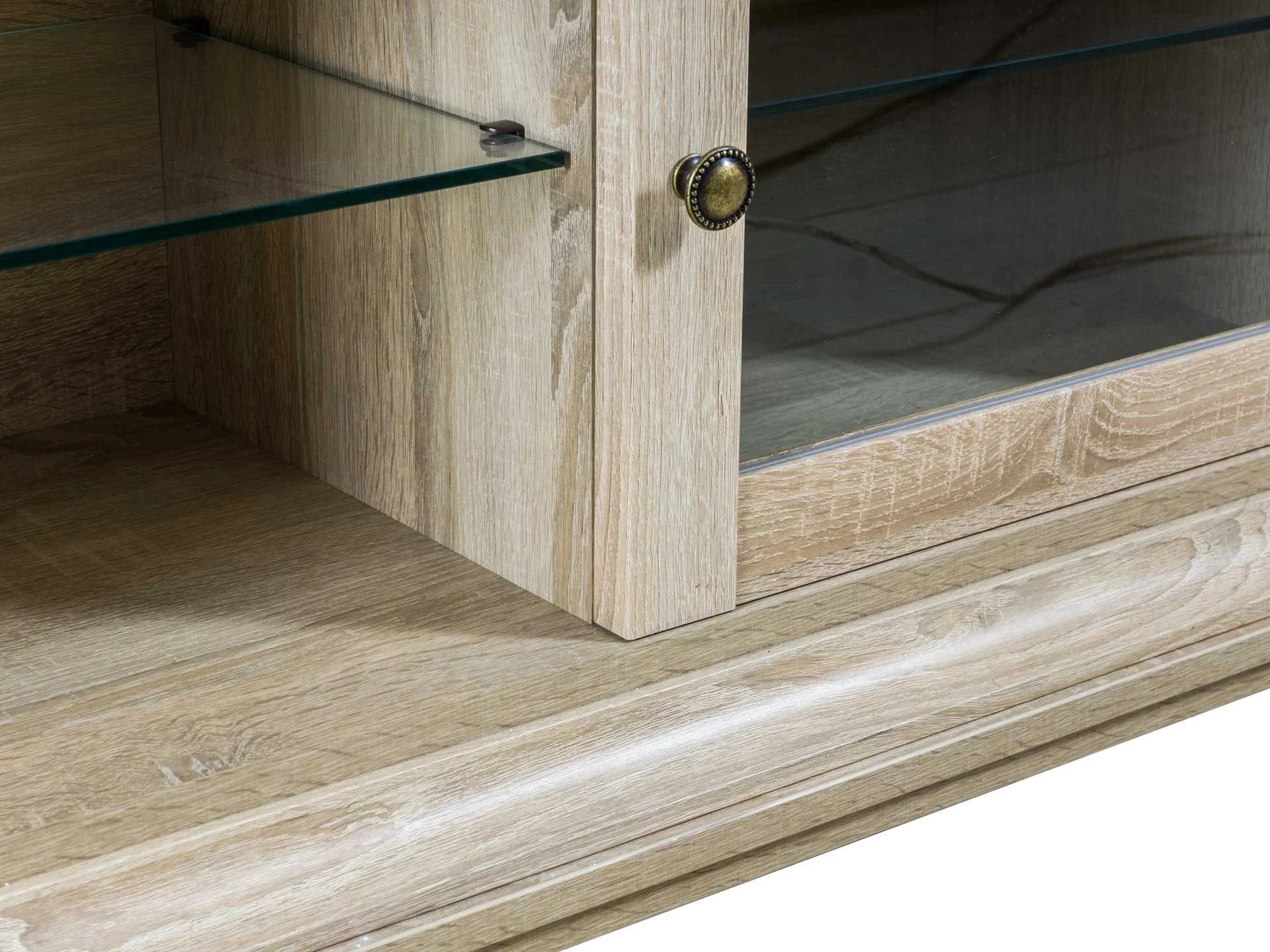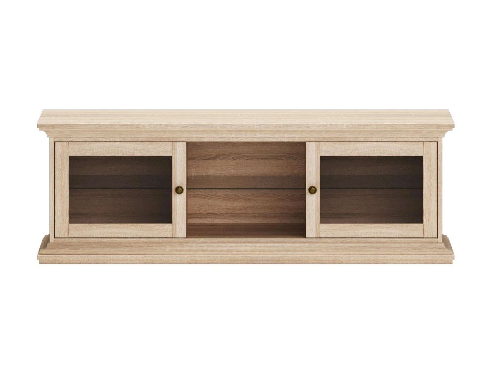 Тумба под ТВ состоит из трех отделений. Среднее отделение открытое, со съемной стеклянной полкой. Левое и правое отделения с распашными дверцами и стеклянными съемными полками.