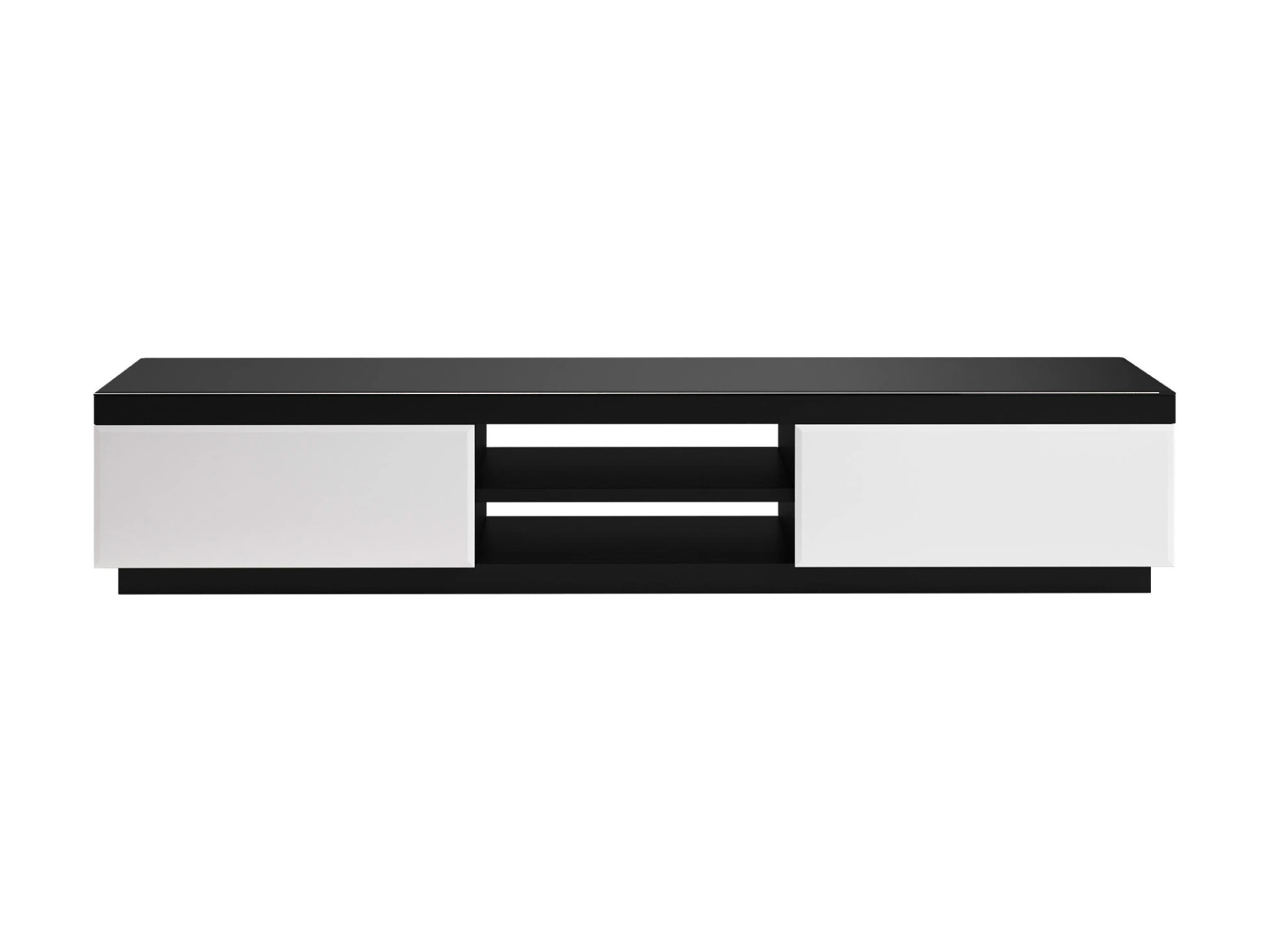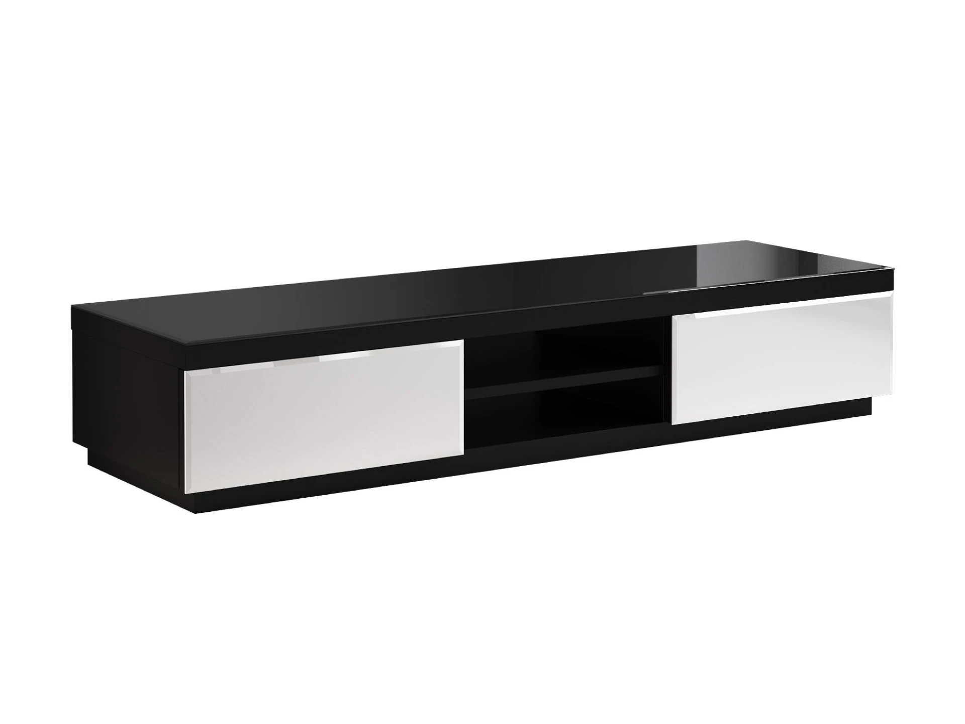 Тумба для телеаппаратуры с двумя выдвижными ящиками и полкой между ними.|Фасадные стенки ящиков и верхняя поверхность тумбы декорированы стеклом.|Ящики открываются по принципу «нажал-открыл».
