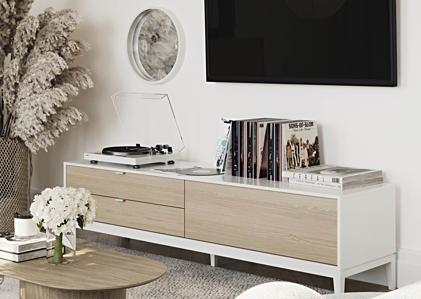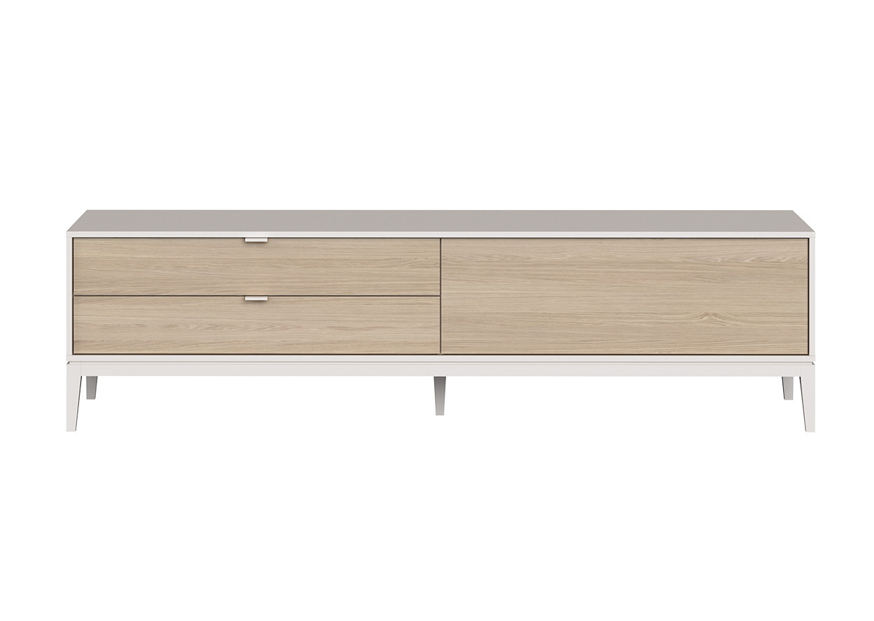 Тумба Fjord 1 дверь 2 ящика Высота: 54 см Ширина: 202 см Глубина: 51 см Основание: массива бука Корпус: МДФ под эмалью Фасады: шпон дуба