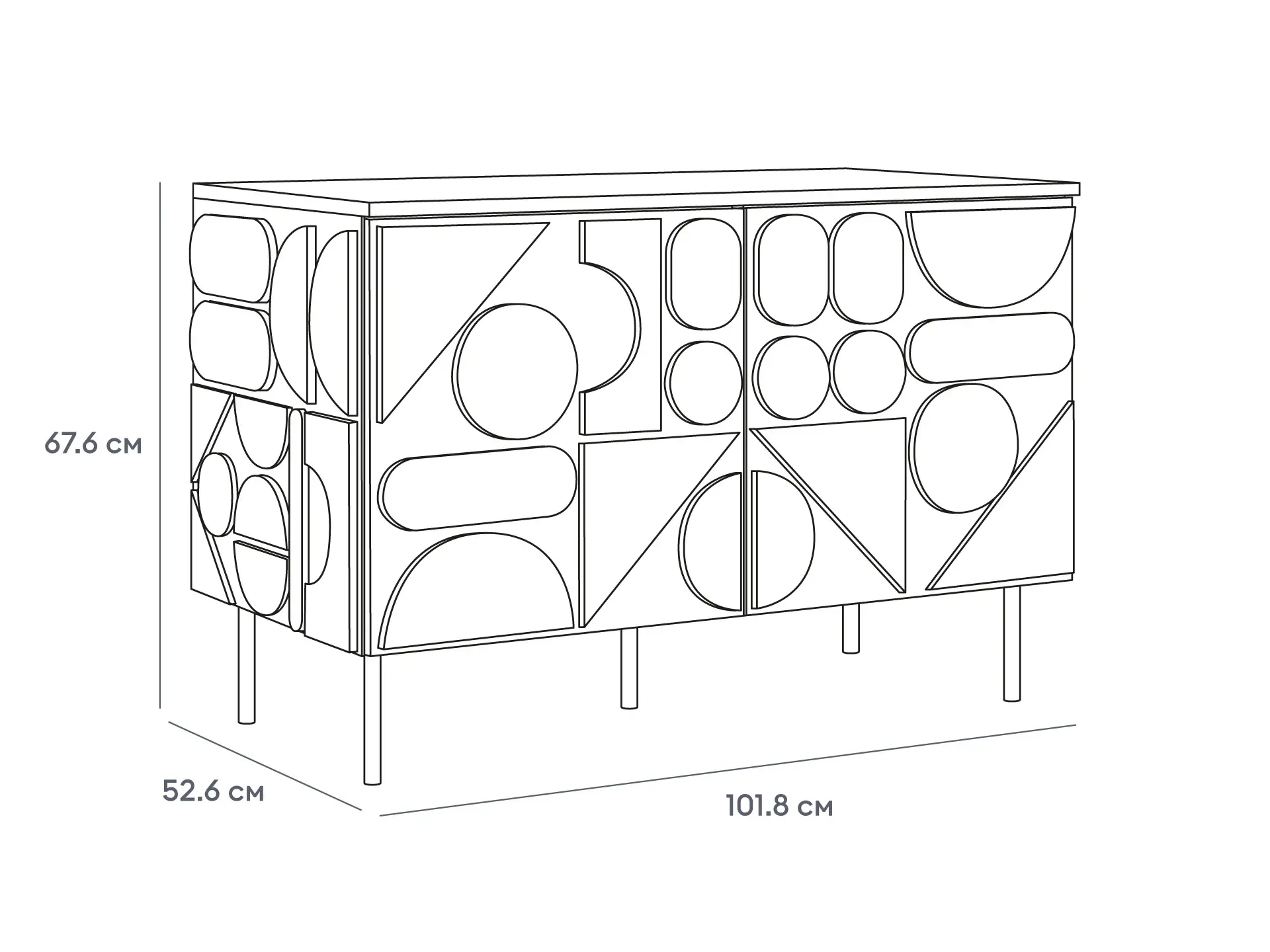 Тумба с двумя распашными дверями, расположенными в ряд. За каждой дверью отделение со съёмной полкой. Перестановка полок по высоте не предусмотрена.