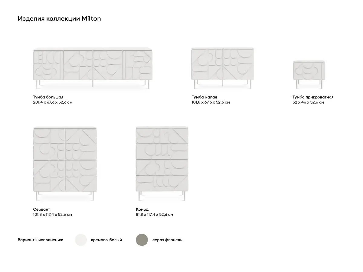Milton — линейка корпусной мебели для хранения с динамичным характером. Яркой чертой дизайна являются геометрические фигуры, закреплённые на фасадах и боковых стенках. Они придают изделиям рельефность, оригинальность, выразительность. Серванты, комоды, тумбы напоминают объёмные 3-D головоломки. Архитектура которых строится на комплиментарности контрастов. Колоритный «верх» балансирует на изящных ножках из металла. Фасады без ручек открываются с помощью механизма «нажал-открыл».