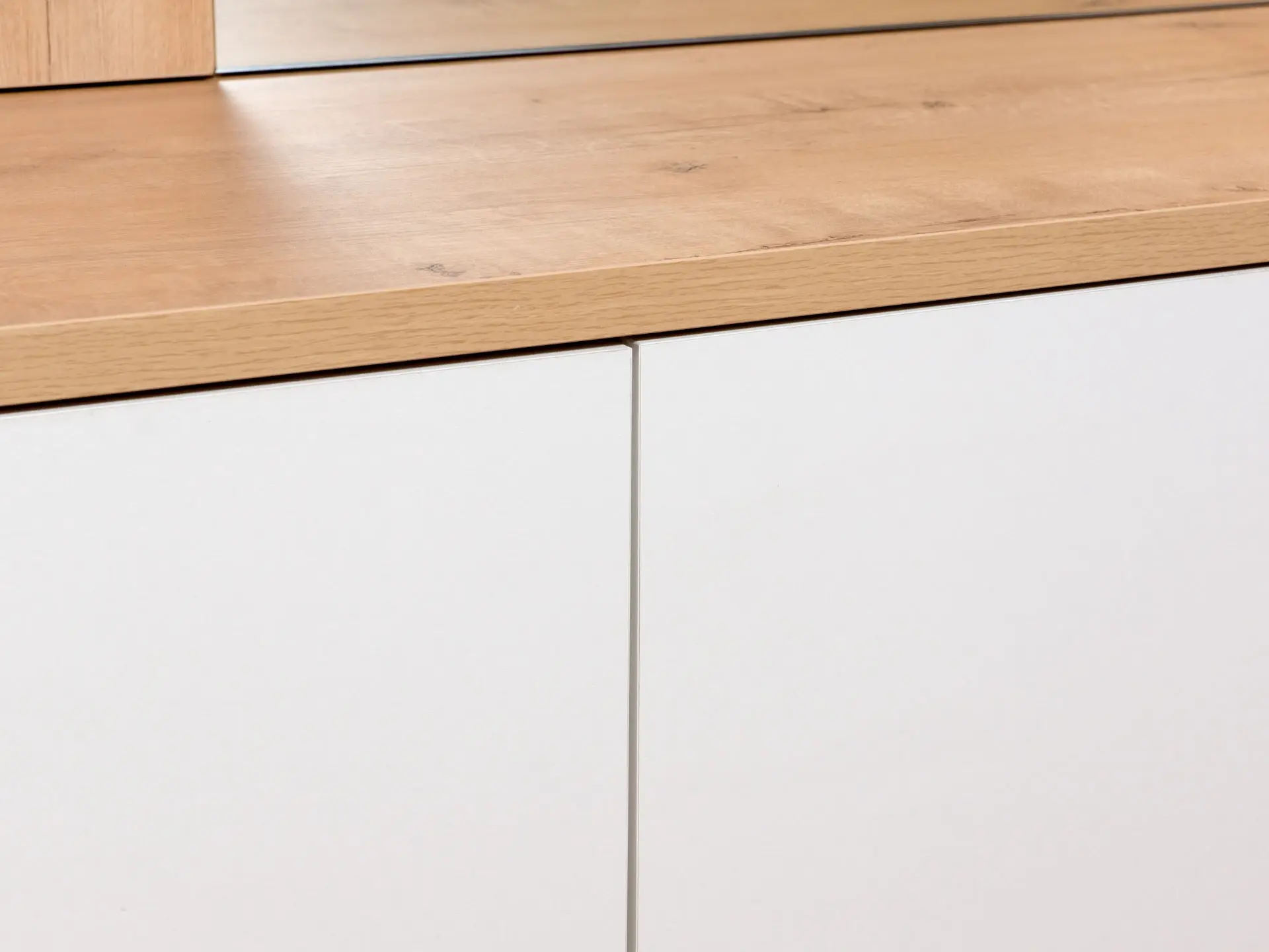 Тумба большая Modus состоит из корпуса и фасада. Корпус с проходной крышкой и нижним щитом установлен на регулируемые пластиковые опоры. Опоры регулируемые, пластик черный, круглые. Корпус перегородкой разделен на два отделения по длине. В каждом отделении располагается съёмная полка. Фасад представляет собой две двери, каждая из которых закрывает одно отделение. Двери открываются вниз по принципу «нажал-открыл». Двери снабжены газовыми лифтами.