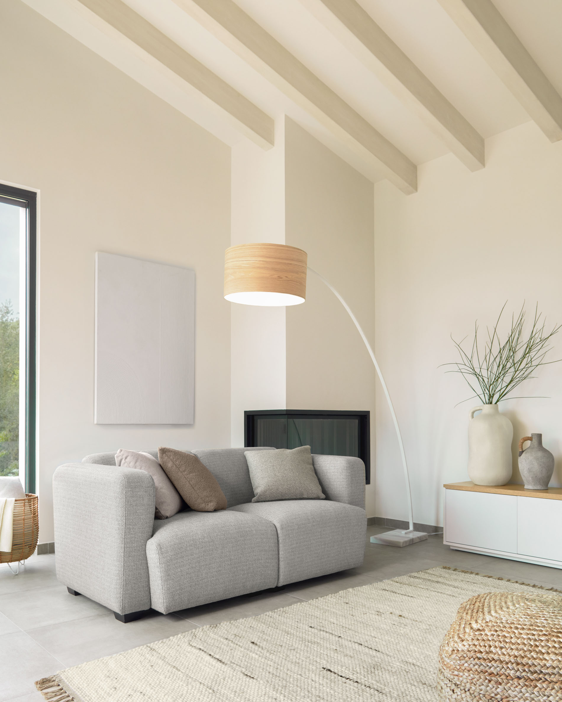 Тумба под телевизор размером 200 x 43,6 см с дубовым шпоном и дверцами в белом лаке. Двери и ящики с нажимной системой и рамой из МДФ.