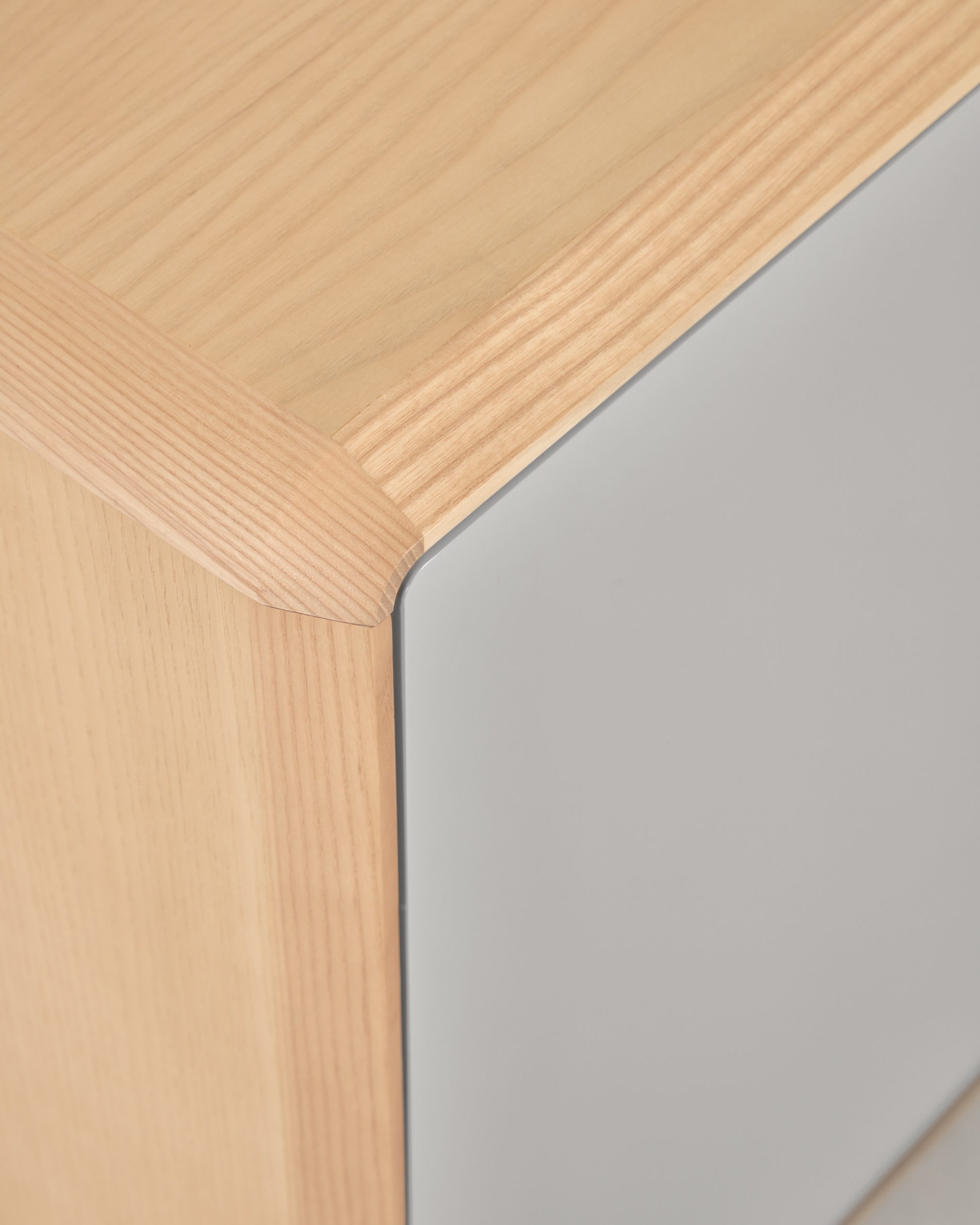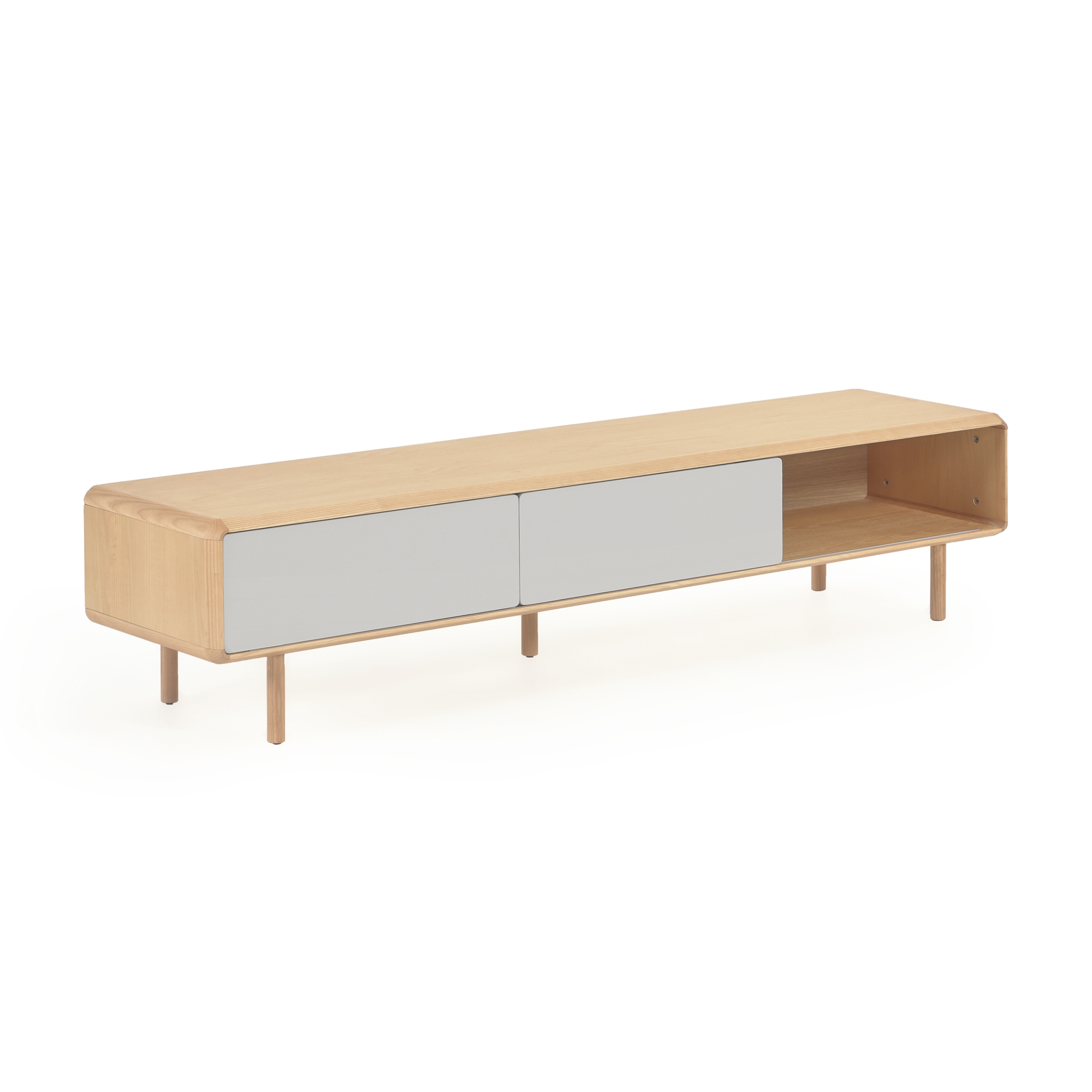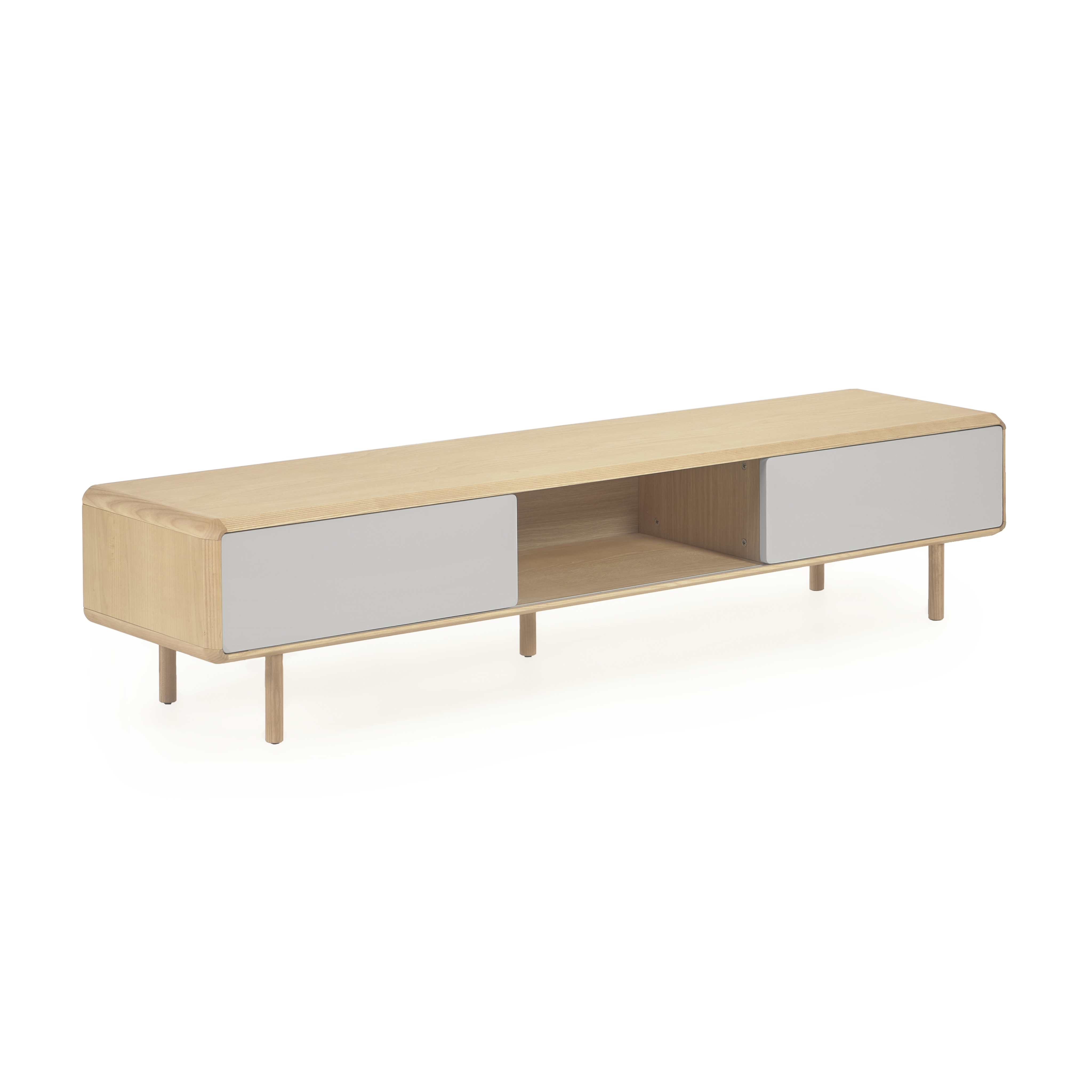 Тумба под телевизор из шпона ясеня с ножками и рамой из массива ясеня. Раздвижные двери и регулируемые ножки. Фасад окрашен в серо-белый цвет.