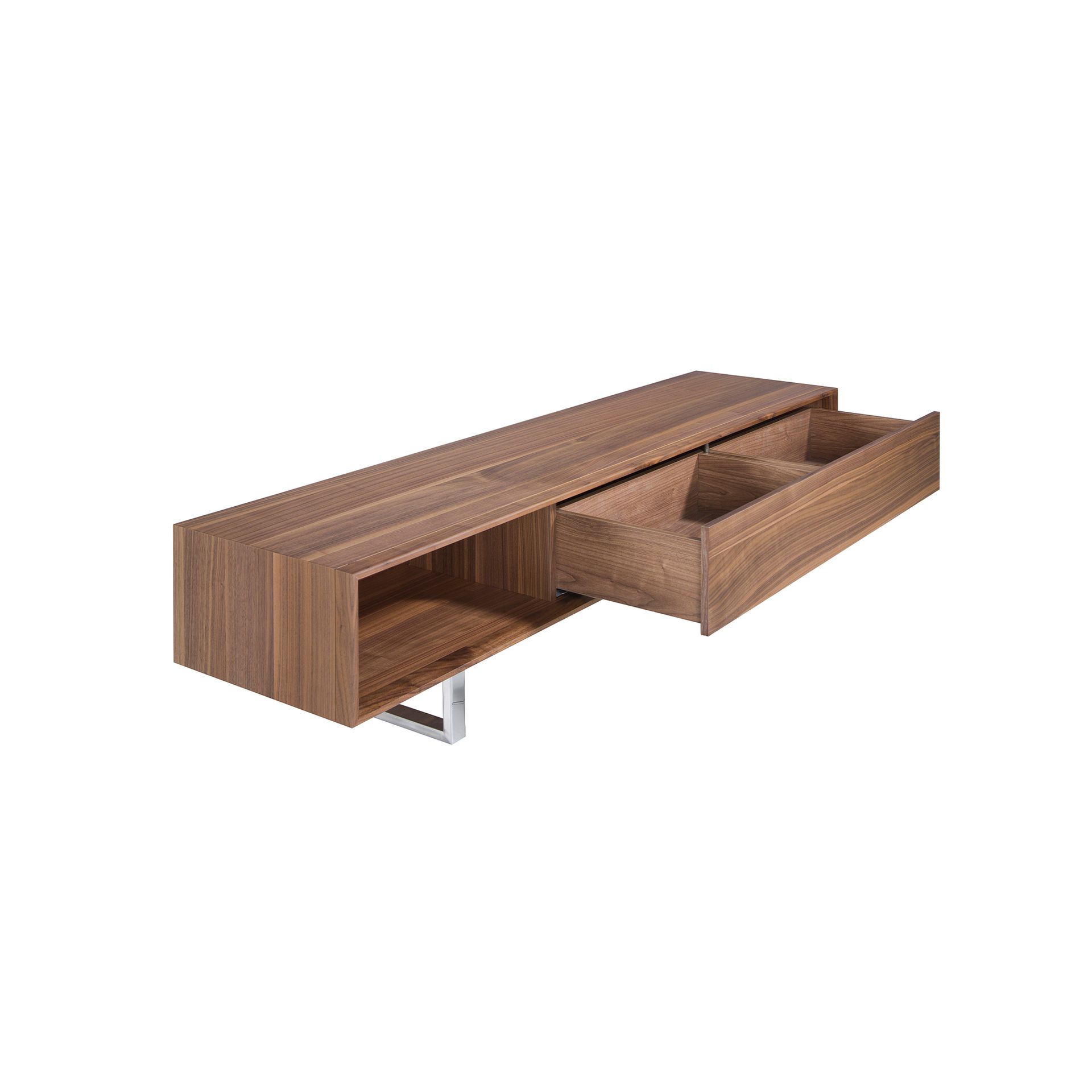 Тумба конструкционно состоит из двух ножек, одного выдвижного ящика и каркаса формы вытянутого прямоугольника. Широкий выдвижной ящик длиной 120 см — это вместительное хранилище для дисков, игровых приставок и прочих девайсов, которые обычно загромождают пространство возле телевизора. Ящик оснащен прочными металлическими направляющими и доводчиком на открывание и закрывание.