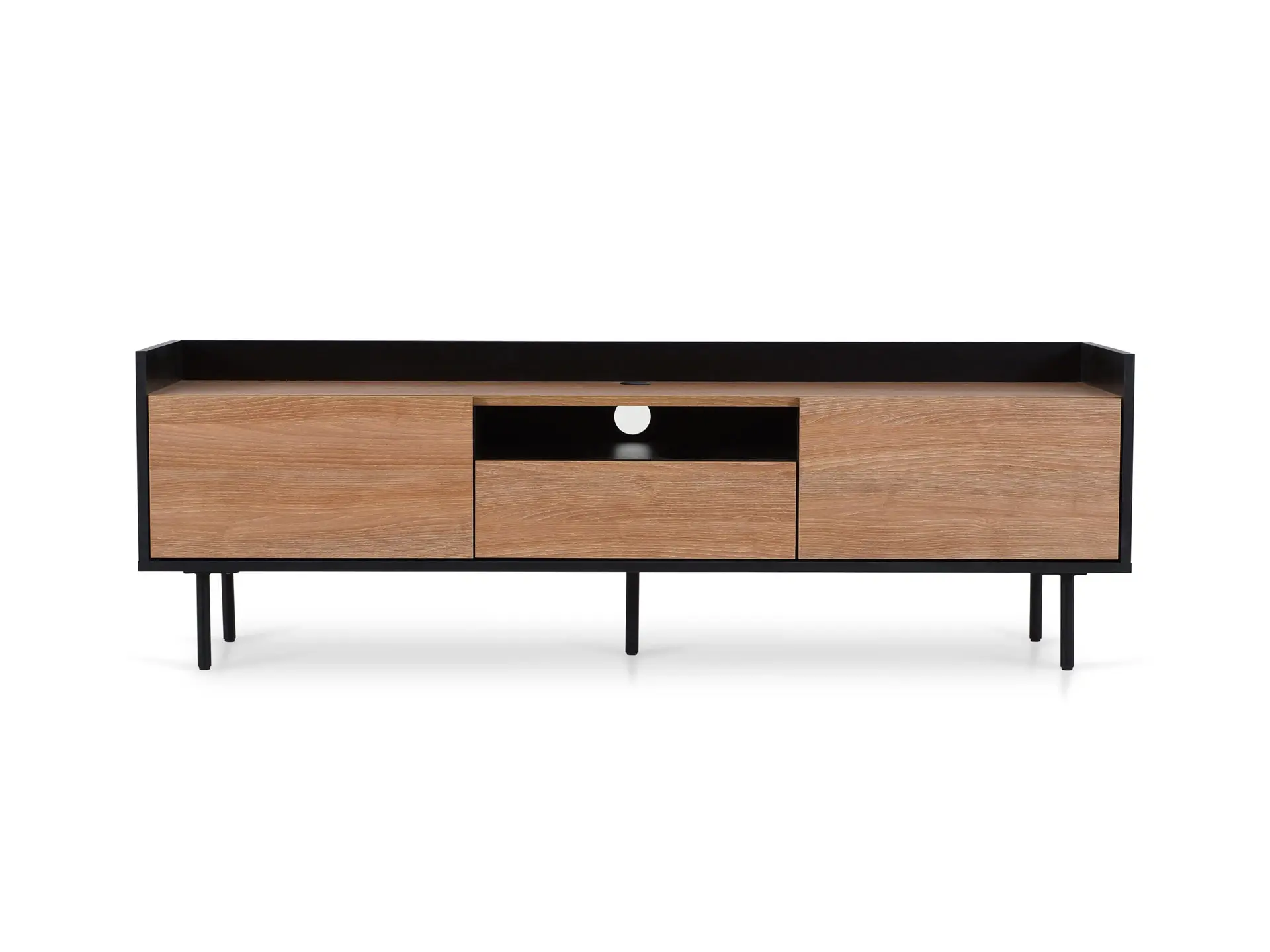 Особенность линейки заключается в контрасте элементов. Скругленные изящные металлические ножки поддерживают внушительное основание. При этом внешний вид моделей остается лёгким и элегантным. Также игру противоположностей усиливают древесная текстура на фасадах и черный цвет боковин с задней стенкой. Что придаёт большей динамики и выразительности дизайну. Эксклюзивность и завершенный вид воссоздает рамка, возвышающаяся над верхним горизонтом. Минималистичный вид конструкциям обеспечивает скрытая фурнитура.