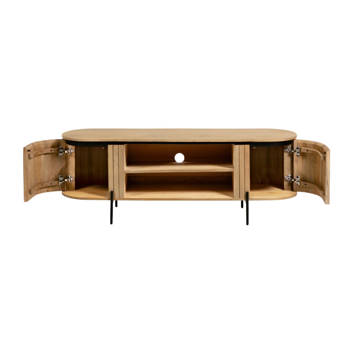Тумба имеет овальную форму, оснащена двумя ящиками и одной полкой. Она полностью сделана из дерева манго, которое отличается прочностью и долговечностью. Для защиты от негативных внешних воздействий массив покрыт специальной пропиткой. Сзади полки есть отверстие для вывода ТВ кабеля диаметром 6,5 см.
