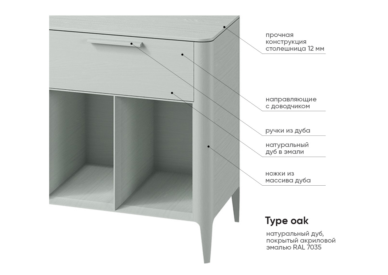 При производстве используется шпон натурального дуба, покрытие эмаль RAL 7035