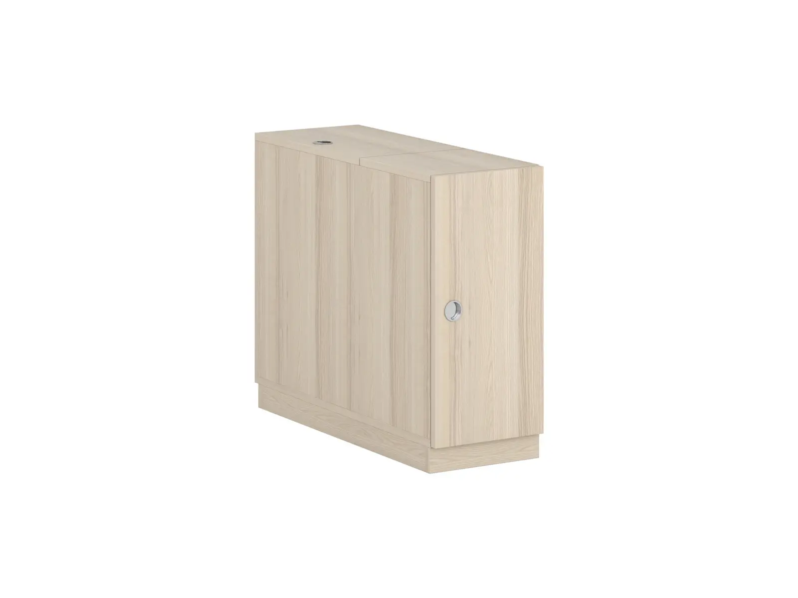 Тумба имеет два отделения. Спереди за распашной дверцей расположено отделение с полкой. В верхней части расположено вместительное отделение для хранения белья. Тумба комбинируется с кроватью односпальной Uno 900.