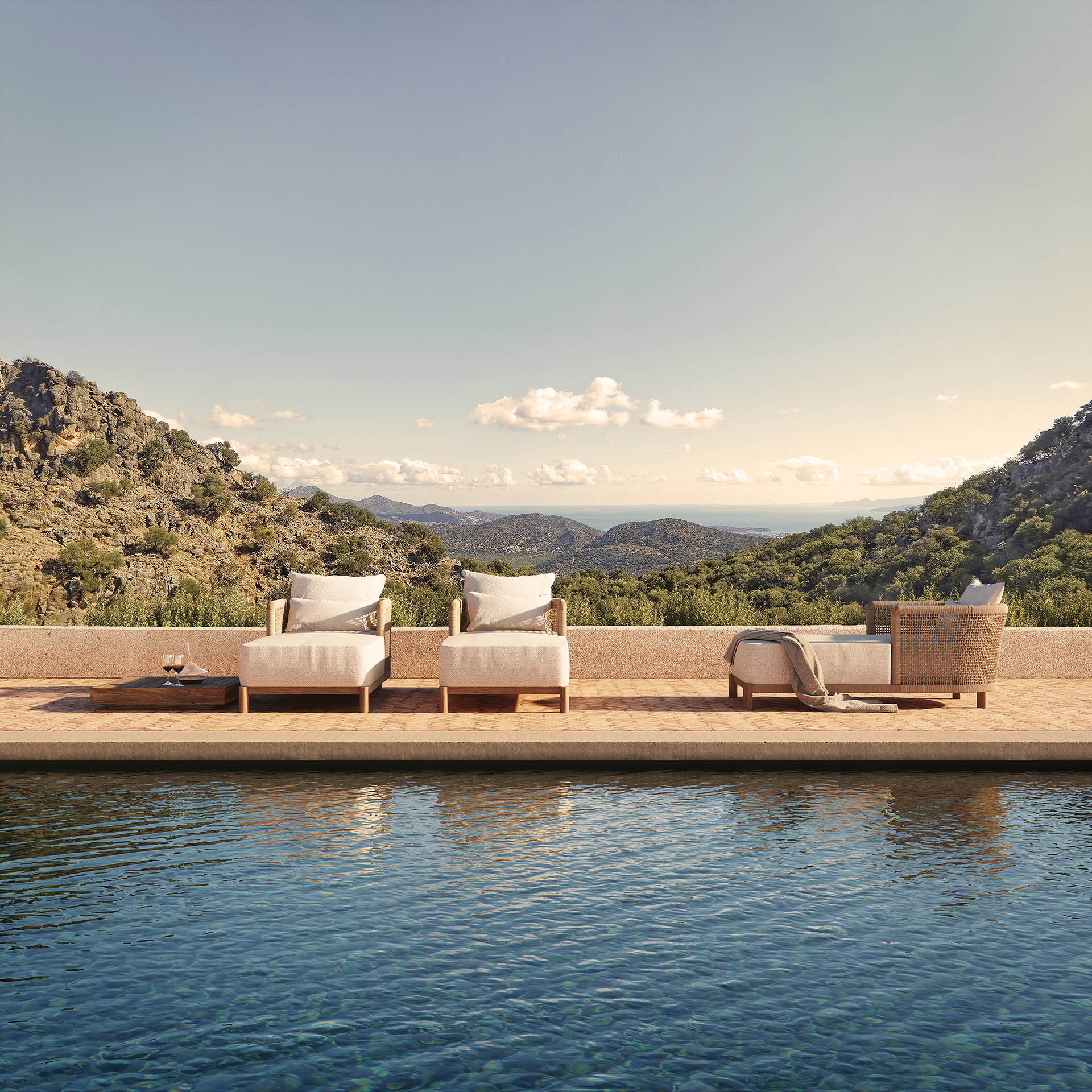 Элегантность коллекции Trena — это сумма двух концепций: легкости и силы. Спинка представлена как обволакивающая деталь, охватывающая весь комплект, создавая интимное пространство, где основным материалом является веревка. На диване ротанг покоится на платформе из переработанного тикового дерева: конструкция, которая поддерживает его, приподнимает и придает ощущение невесомости, нежности и утонченности.