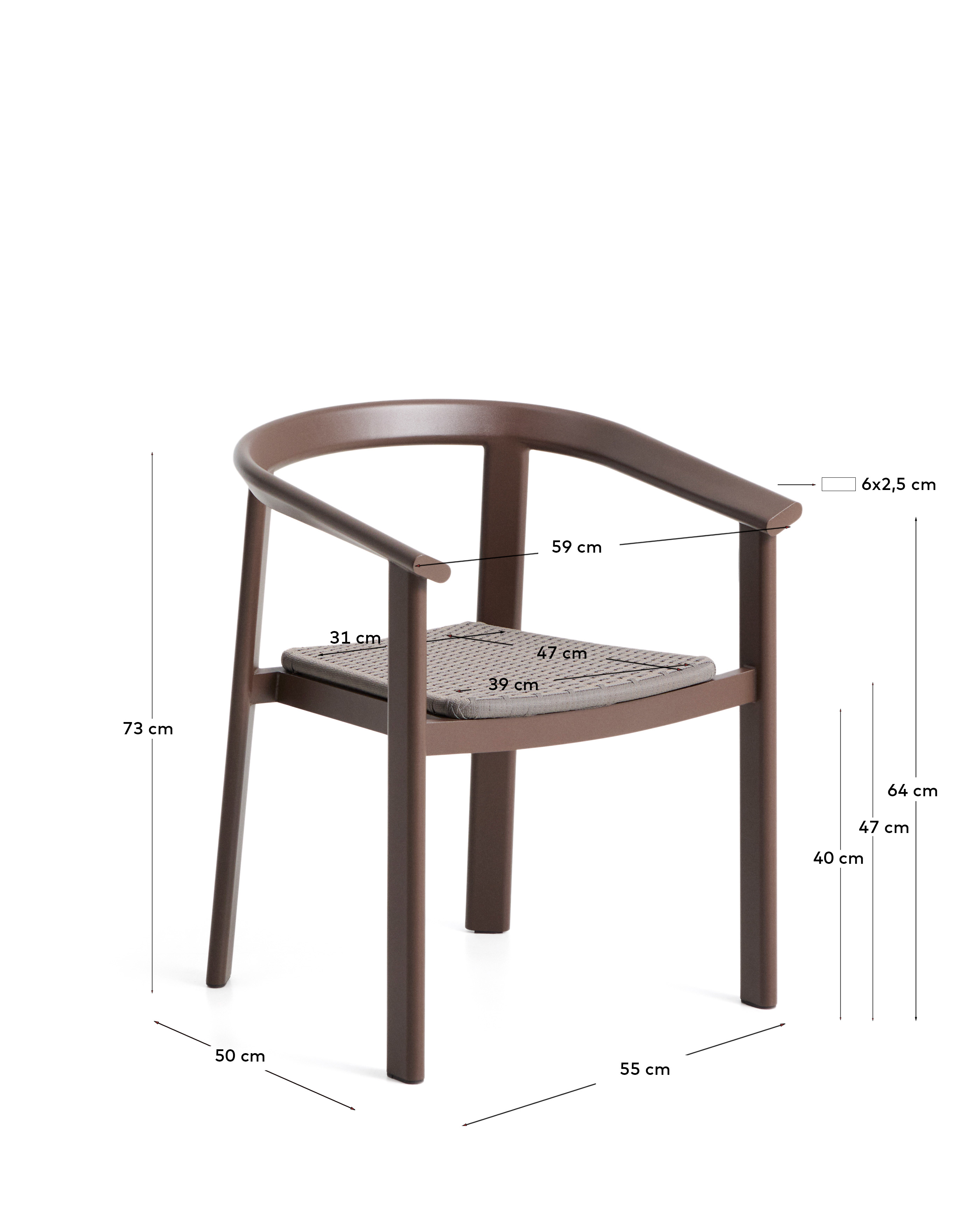 Кресло Erice имеет подлокотники и алюминиевую конструкцию — легкий и прочный материал. Сиденье, обтянутое вручную веревочным шнуром, добавляет текстуру и обработано для защиты от ультрафиолетового излучения, сохраняя свой внешний вид на протяжении длительного времени. Алюминиевая конструкция обладает высокой устойчивостью к ржавчине, коррозии и ультрафиолетовым лучам, что делает ее на 100% подходящей для использования на открытом воздухе. Функциональное и прочное изделие, разработанное для адаптации как к внутренним, так и к внешним пространствам.