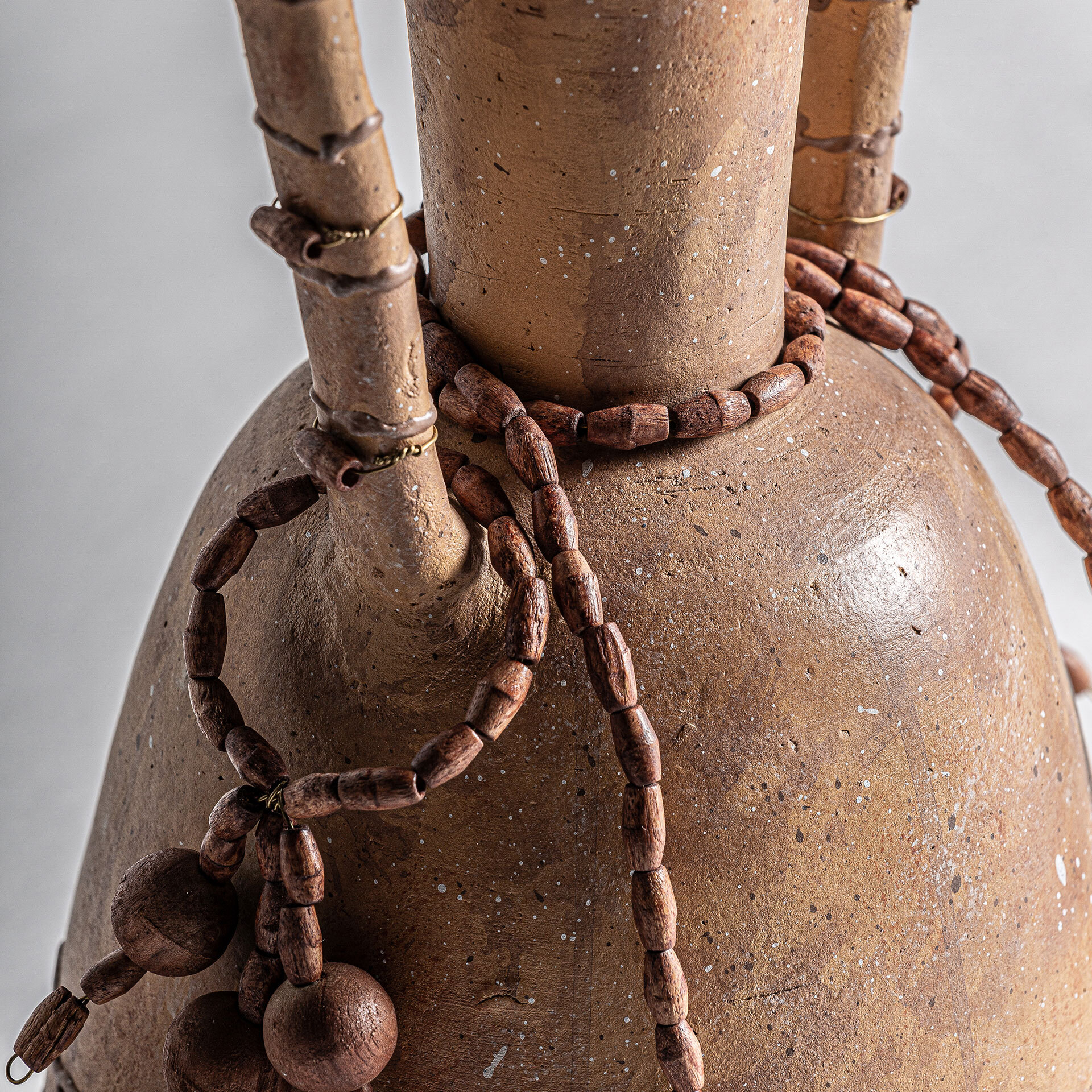 Ваза полностью изготовлена из керамики в натуральной отделке. Сверху нанесен графический узор в виде лепнины. Горловина украшена деревянными бусинами.