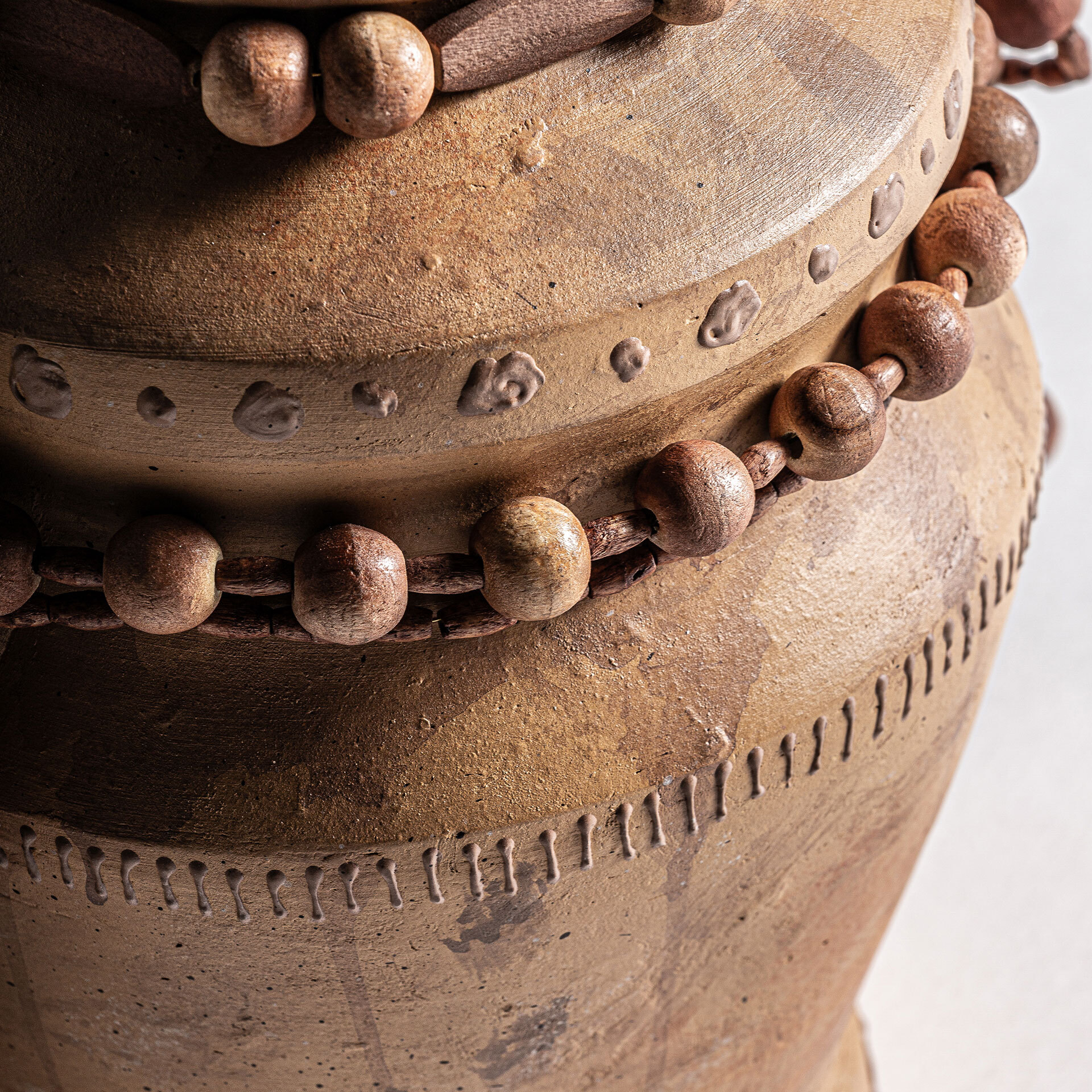Ваза полностью изготовлена из керамики в натуральной отделке. Сверху нанесен графический узор в виде лепнины. Горловина украшена деревянными бусинами.