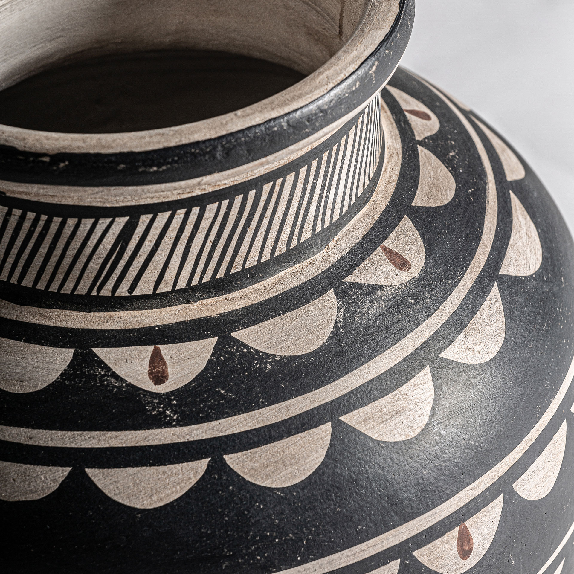 Ваза имеет форму выпуклого кувшина с широким горлом, что в сочетании с серым цветом и графическим рисунком придает ей средиземноморский вид.