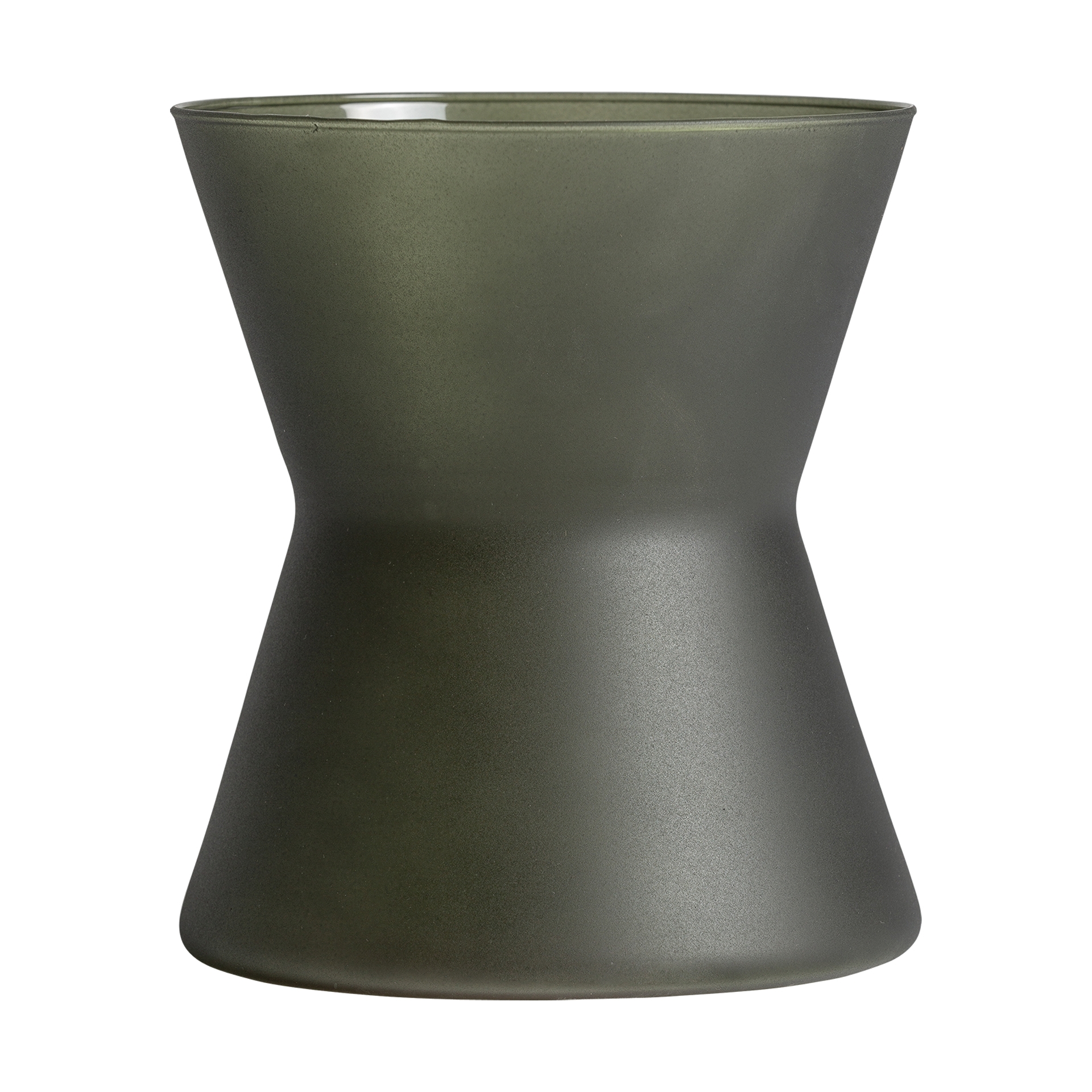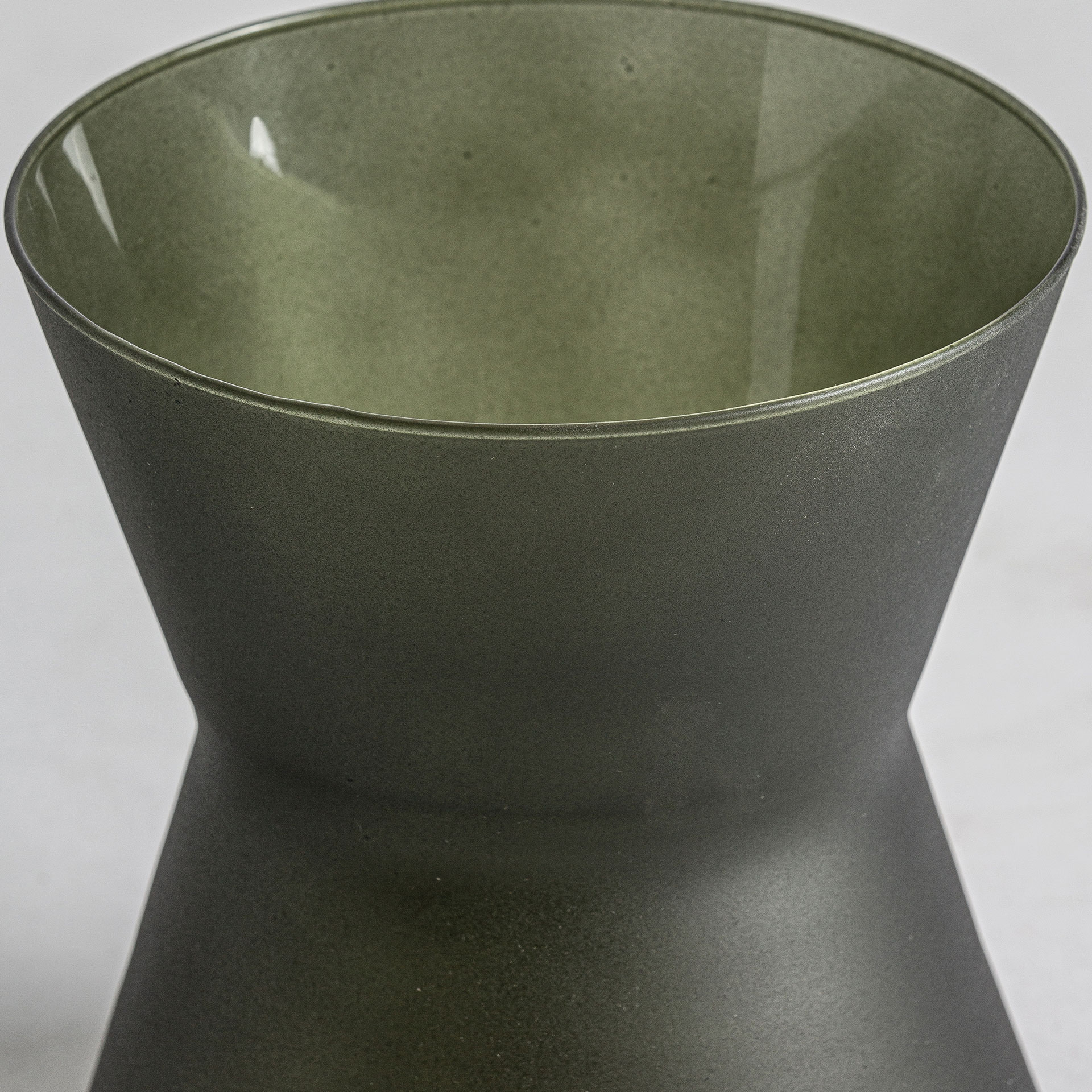 Ваза сделана из темно-зеленого стекла с матовым покрытием. Обтекаемую коническую форму завершает в нижней части круглая стойка, что эффектно подчеркивает всю геометрию.