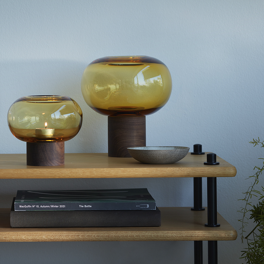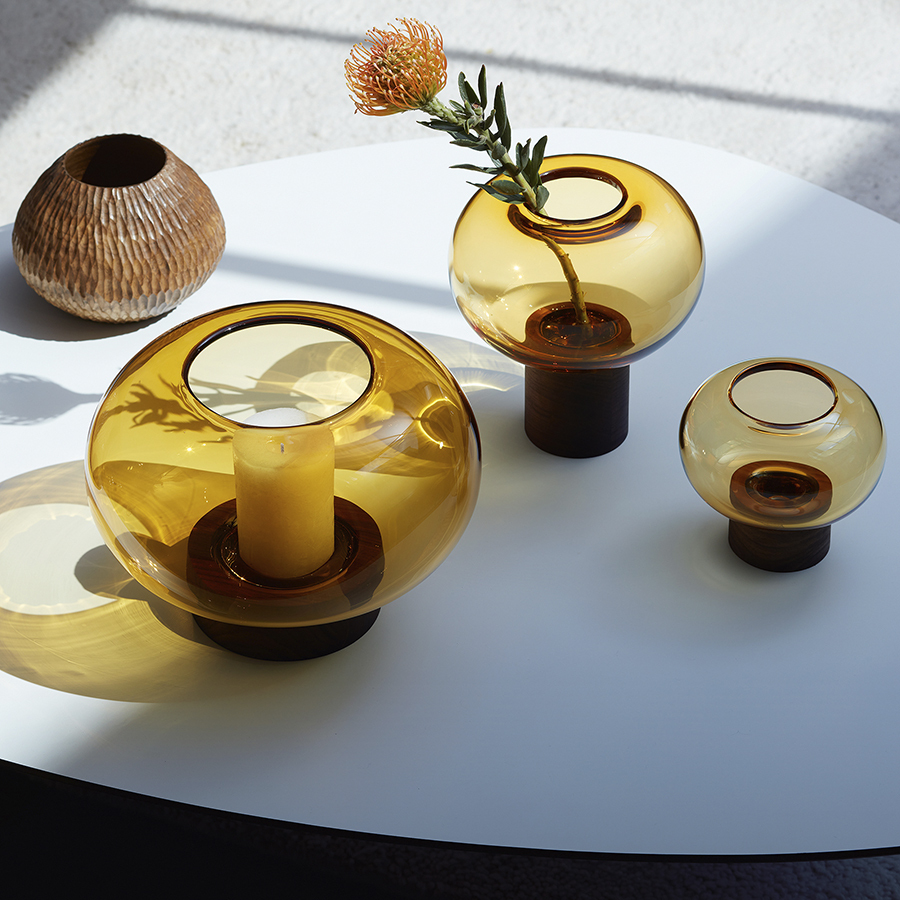 Дизайнерская ваза сферической формы с основанием из ореха Oblate может служить сосудом для невысоких свежесрезанных букетов, цветочным горшком или арт-объектом.