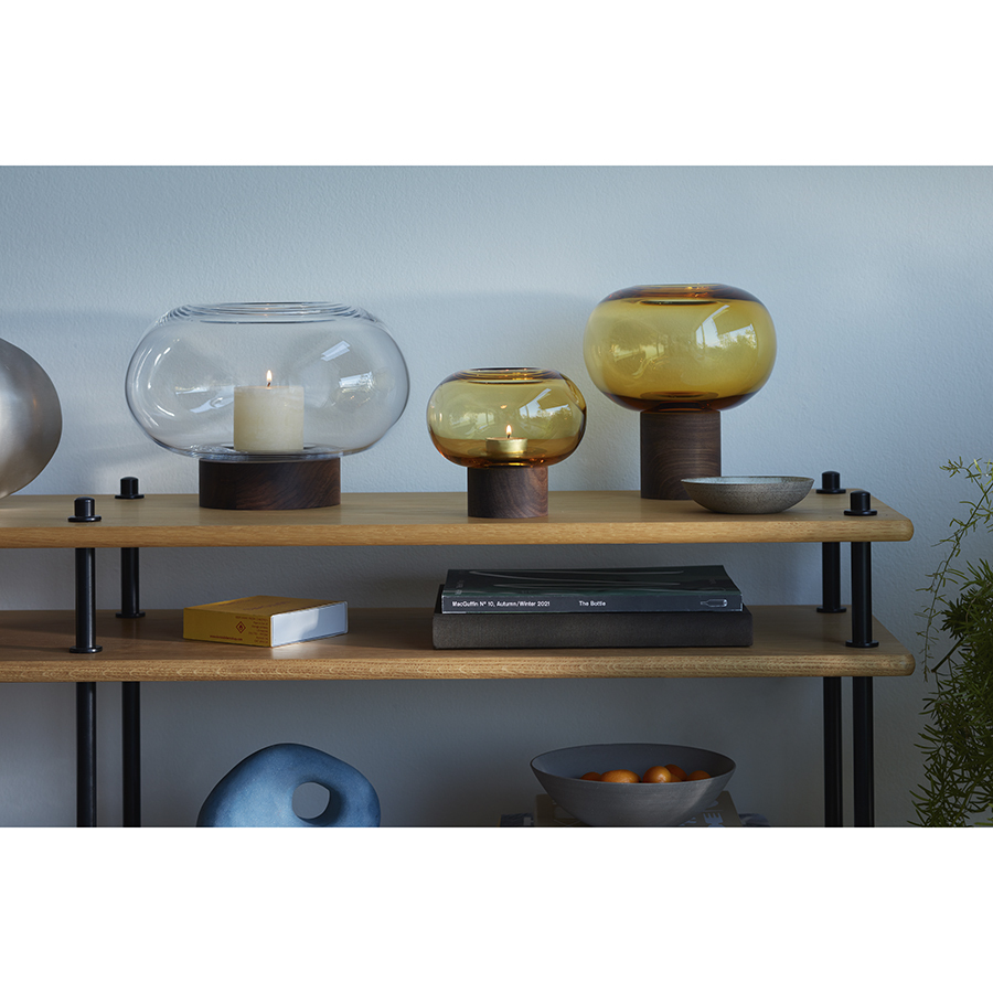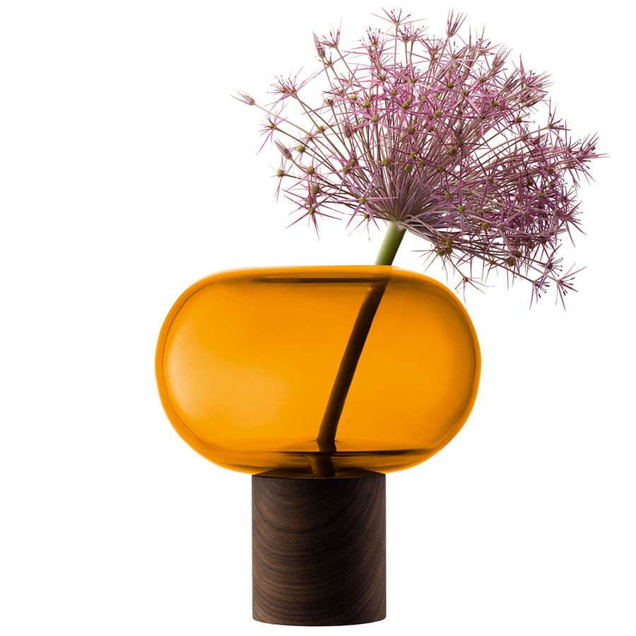 Дизайнерская ваза сферической формы с основанием из ореха Oblate может служить сосудом для невысоких свежесрезанных букетов, цветочным горшком или арт-объектом.