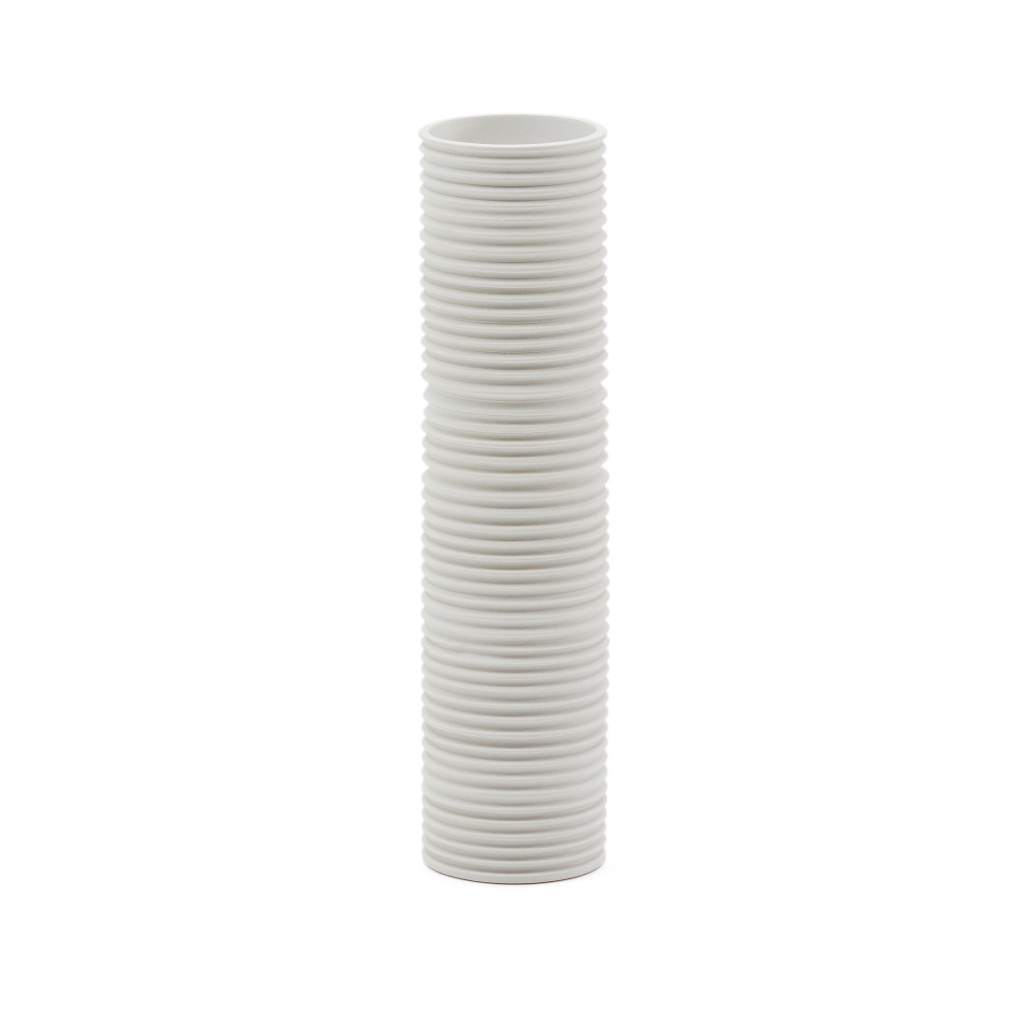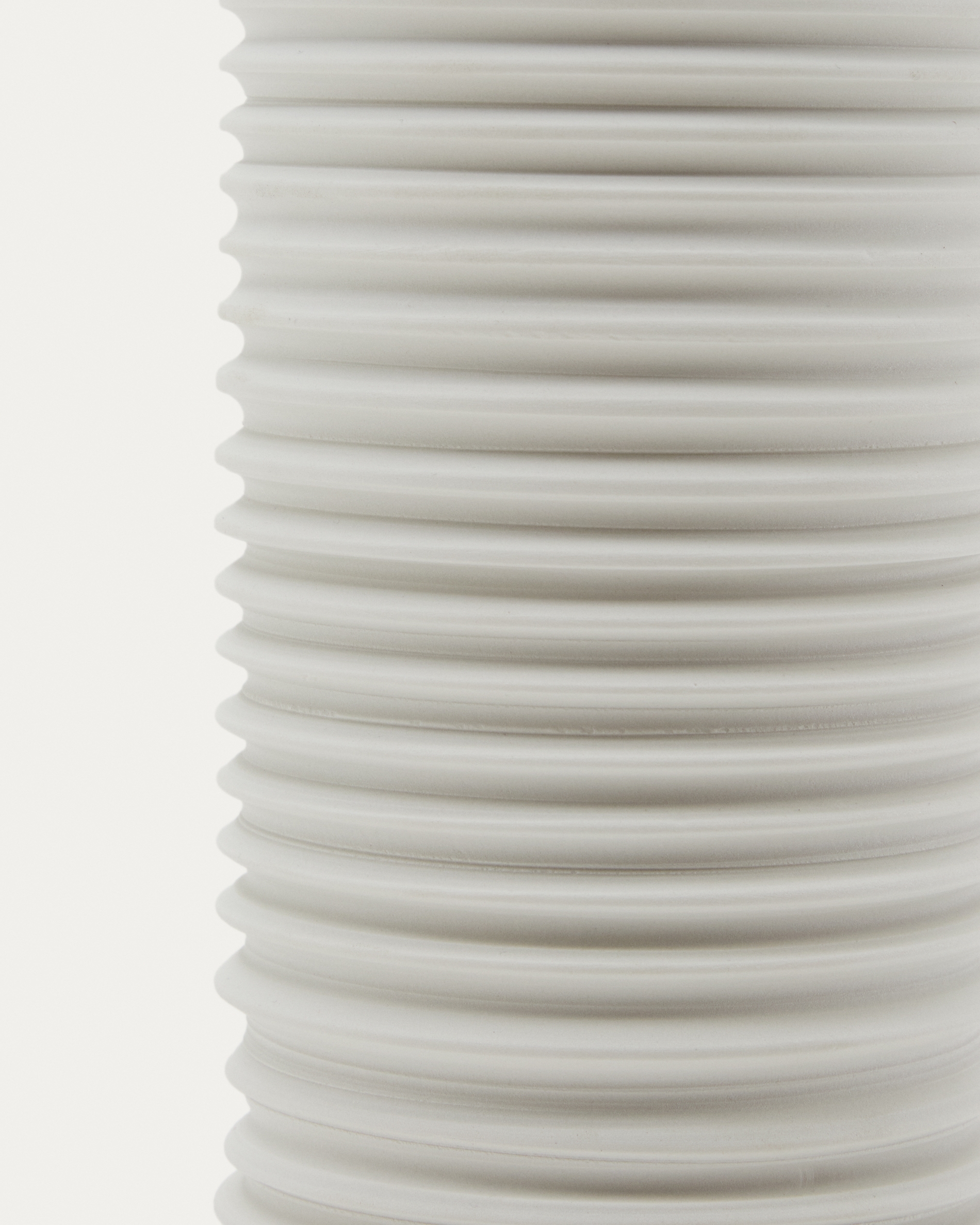 Ваза имеет форму цилиндра с нарезной фактурой. Материал изготовления – керамика белого цвета. Это натуральный экологичный материал, который не портится от влаги и солнца.