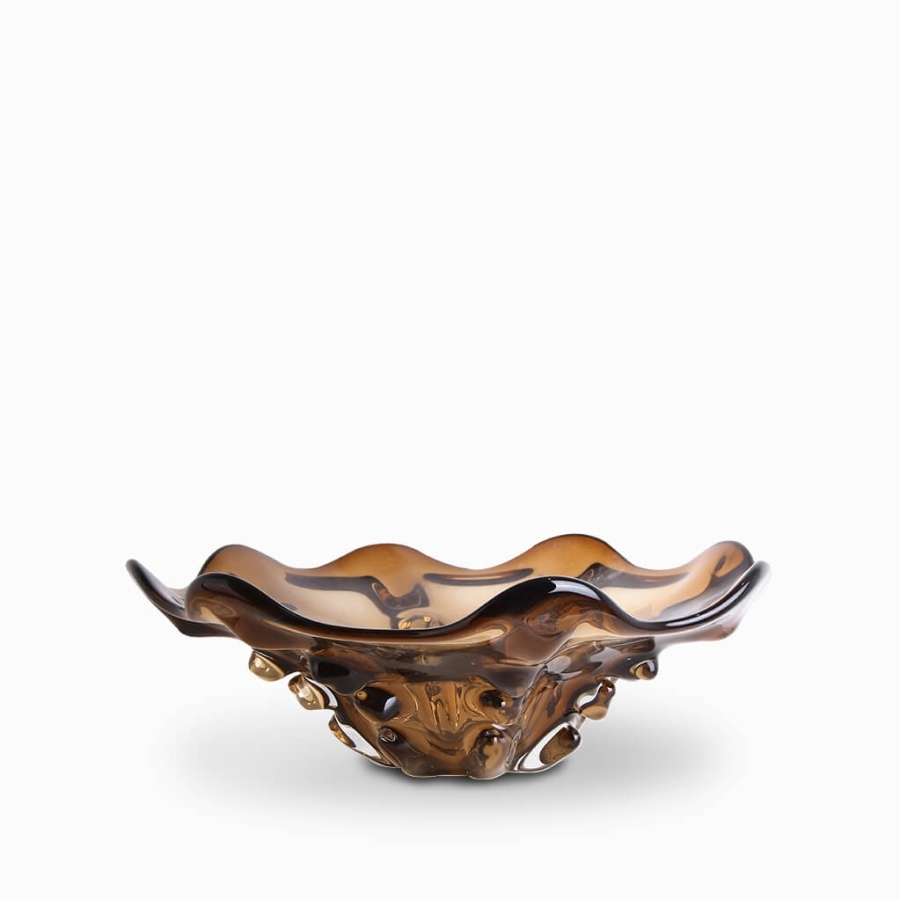 Изготовлена из коричневого стекла, ваза обладает уникальной текстурой и глубиной цвета, что создает эффектный визуальный образ. Элегантные линии и форма вазы напоминают космические объекты, придавая ей современный и стильный вид. Она идеально подходит для создания атмосферы уюта и стиля.