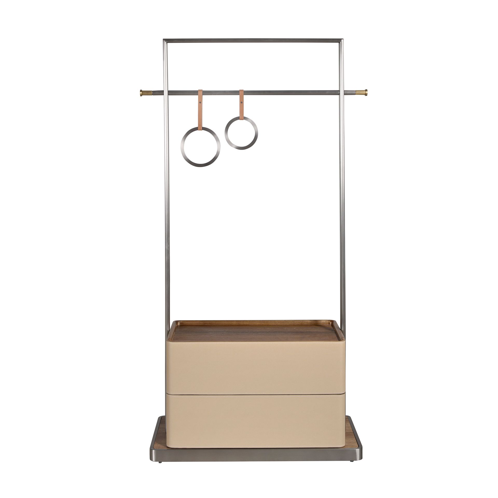 Современная вешалка для одежды из натурального орехового шпона в сочетании с элегантной обивкой из коровьей кожи цвета норки. Дизайн ее основания и структуры из полированной нержавеющей стали, а также ее полированная золотистая стальная деталь привнесут изысканный и эксклюзивный штрих в вашу комнату. Благодаря своему вместительному пространству для хранения с 2 ящиками с ручной системой открывания и системой плавного закрывания, она позволит вам держать все в порядке и на своих местах.