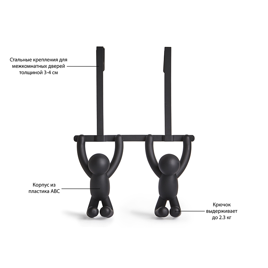 Основание выполнено из сверхпрочного АБС-пластика, устойчивого к износу и воздействию влаги. Конструкция оснащена надежной панелью для удобного крепления к дверям без вкручивания дюбелей или использования клея. Крючки в виде забавных человечков способны выдерживать нагрузку до 2,3 кг.