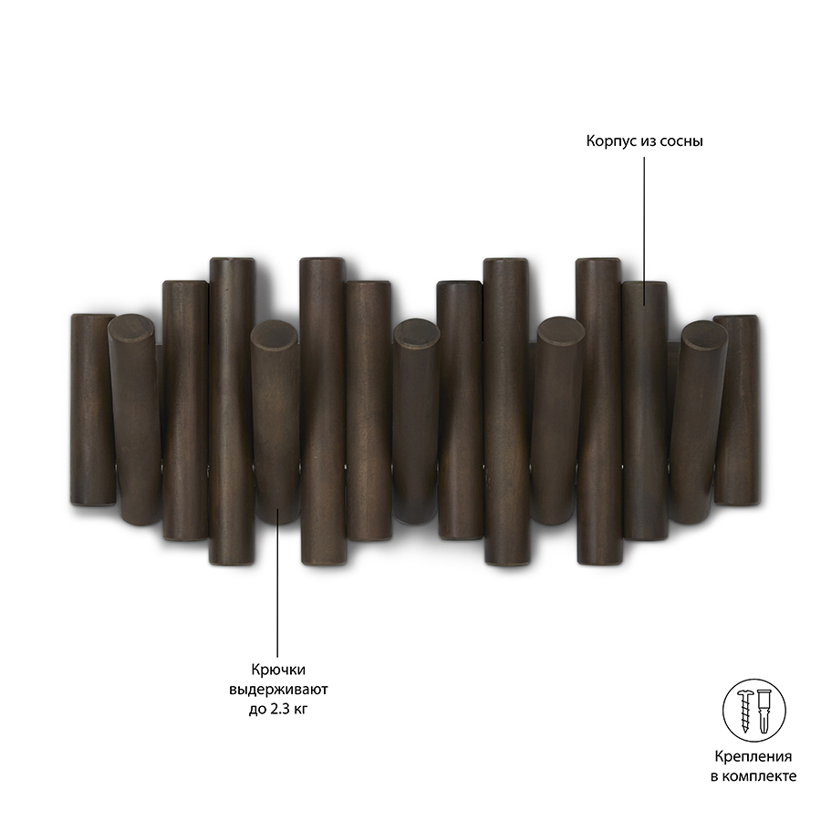 Настенная вешалка Picket превращает функциональность в искусство и идеально подходит для всех, кто ценит красоту в каждой детали. Такой аксессуар не только поможет сделать пространство более организованным, но и станет его стильным акцентом. Вешалка состоит из сосновых колышков разных размеров и оснащена пятью откидными крючками, каждый из которых выдерживать вес до 2,3 кг. Если крючки не используются, их можно легко убрать, превратив функциональный элемент в арт-объект. В комплект входит необходимый крепеж для быстрой и простой установки.