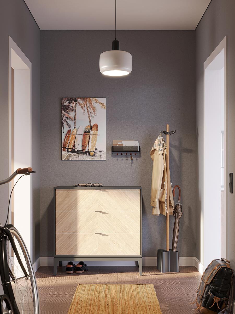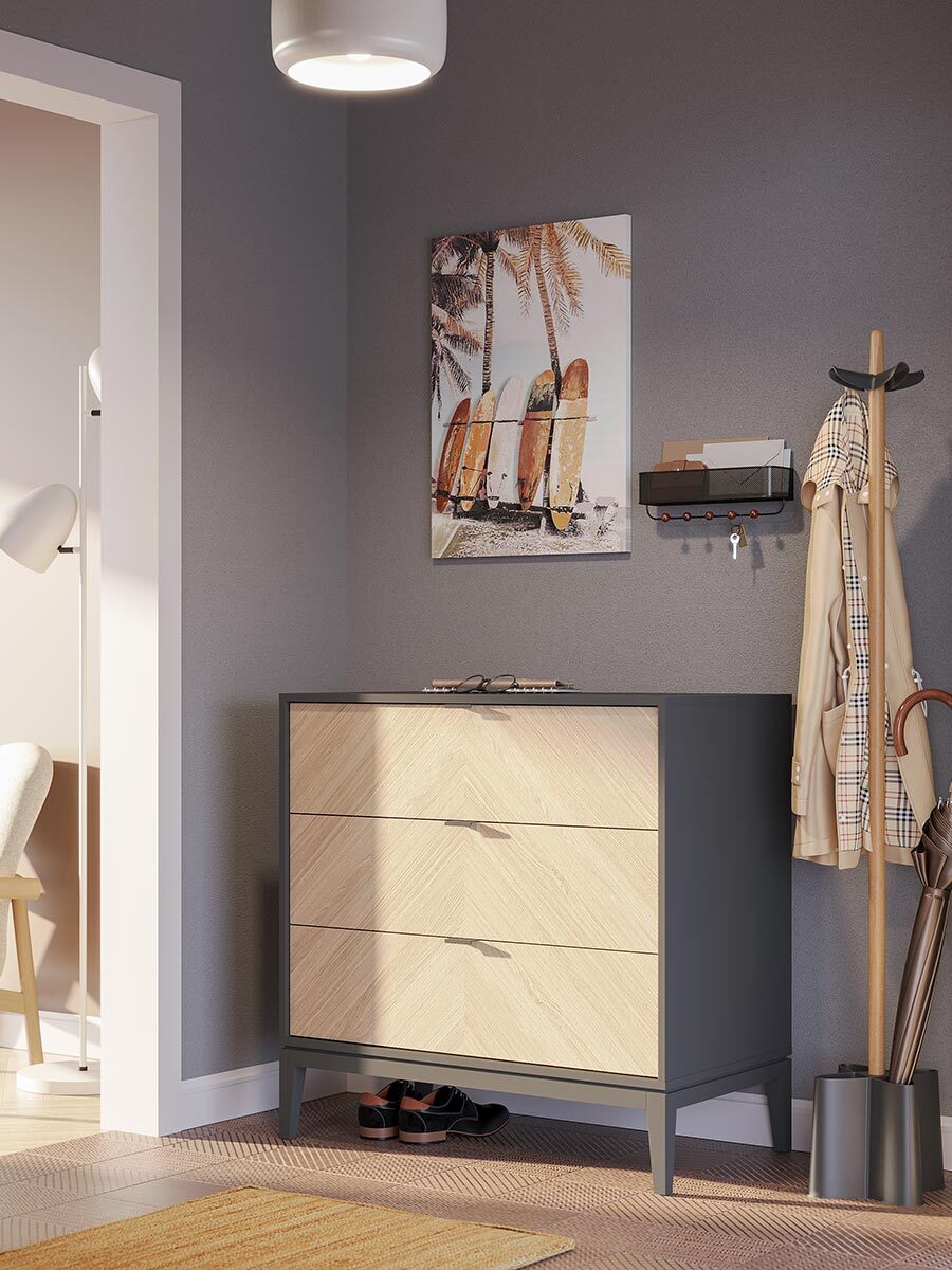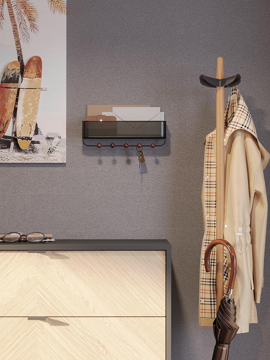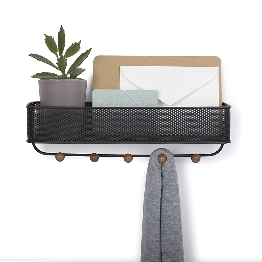 Настенный органайзер выполнен из перфорированного металла и натуральной древесины бука. Каждый крючок выдерживает нагрузку до 2,3 кг. В комплект поставки входит крепеж, что делает установку простой и быстрой.