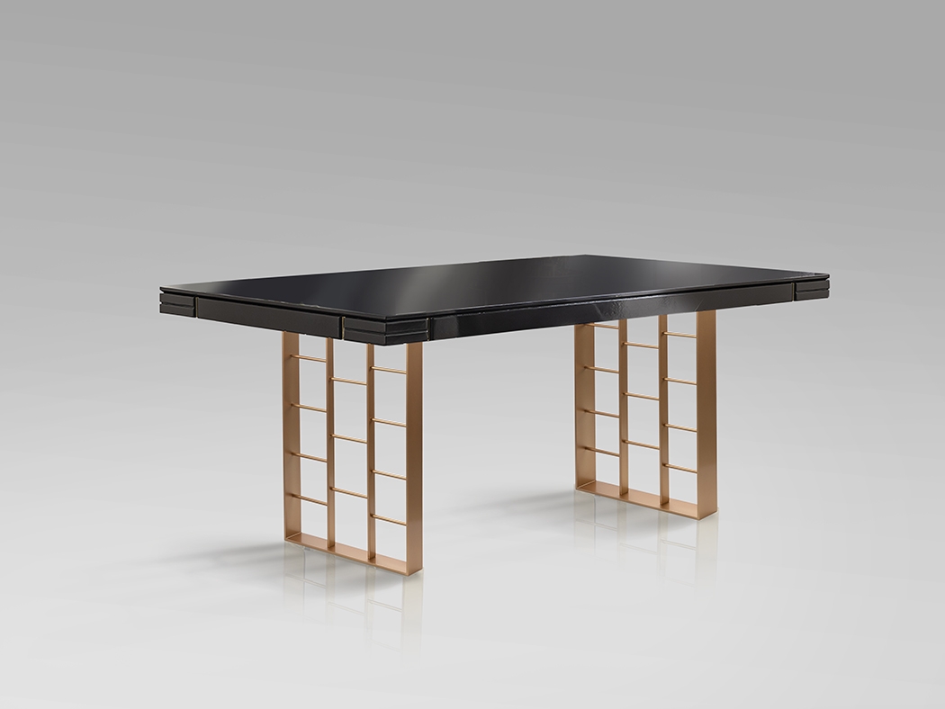 Обеденный стол из МДФ с отделкой антрацитово-серого цвета, глянцевый лак, с декоративными канавками и золотыми пластинами. Металлические ножки с матовой отделкой розовым золотом.